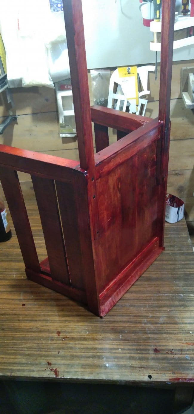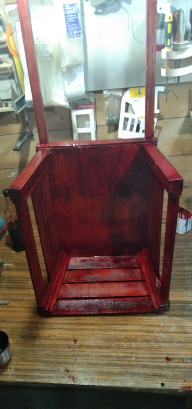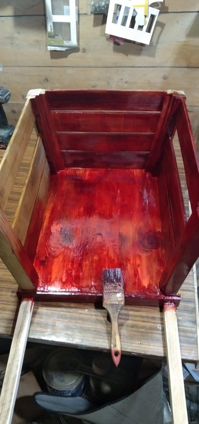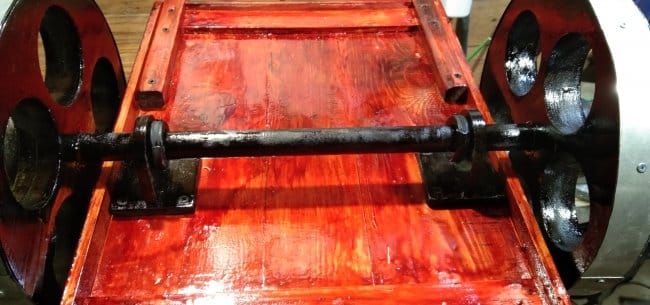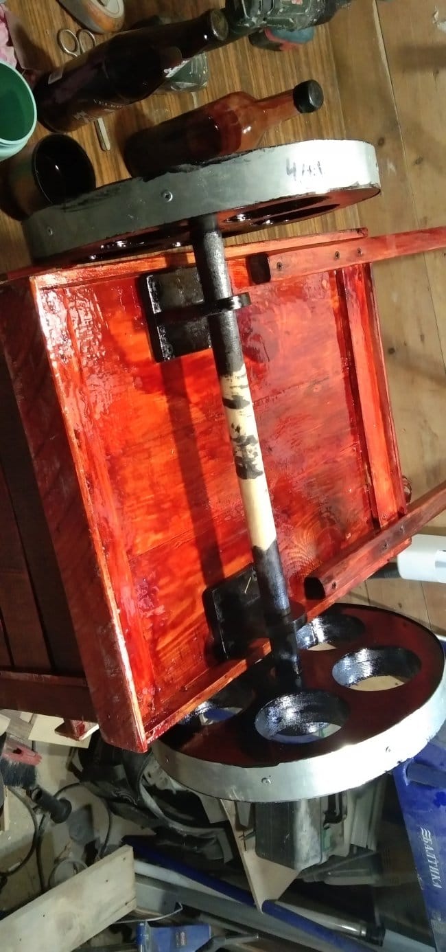 Теперь нужно покрыть телегу лаком. Хотя до этого я и нанес на нее лак, но он слишком светлый, поэтому все устраненные шпатлевкой дефекты были хорошо заметно. Хотя эта телега и делалась для собственных нужд, меня это не устроило. Поэтому купив лак "красное дерево" покрым поверхность изделия им. Теперь уже окончательно устанавливаю колесную пару на тележку и крашу ее лаком "эбеновое дерево". Так же на ось были установлены ограничители, чтобы ось не гуляла по сторонам, а колеса не задевали борта тележки и не портили ее.