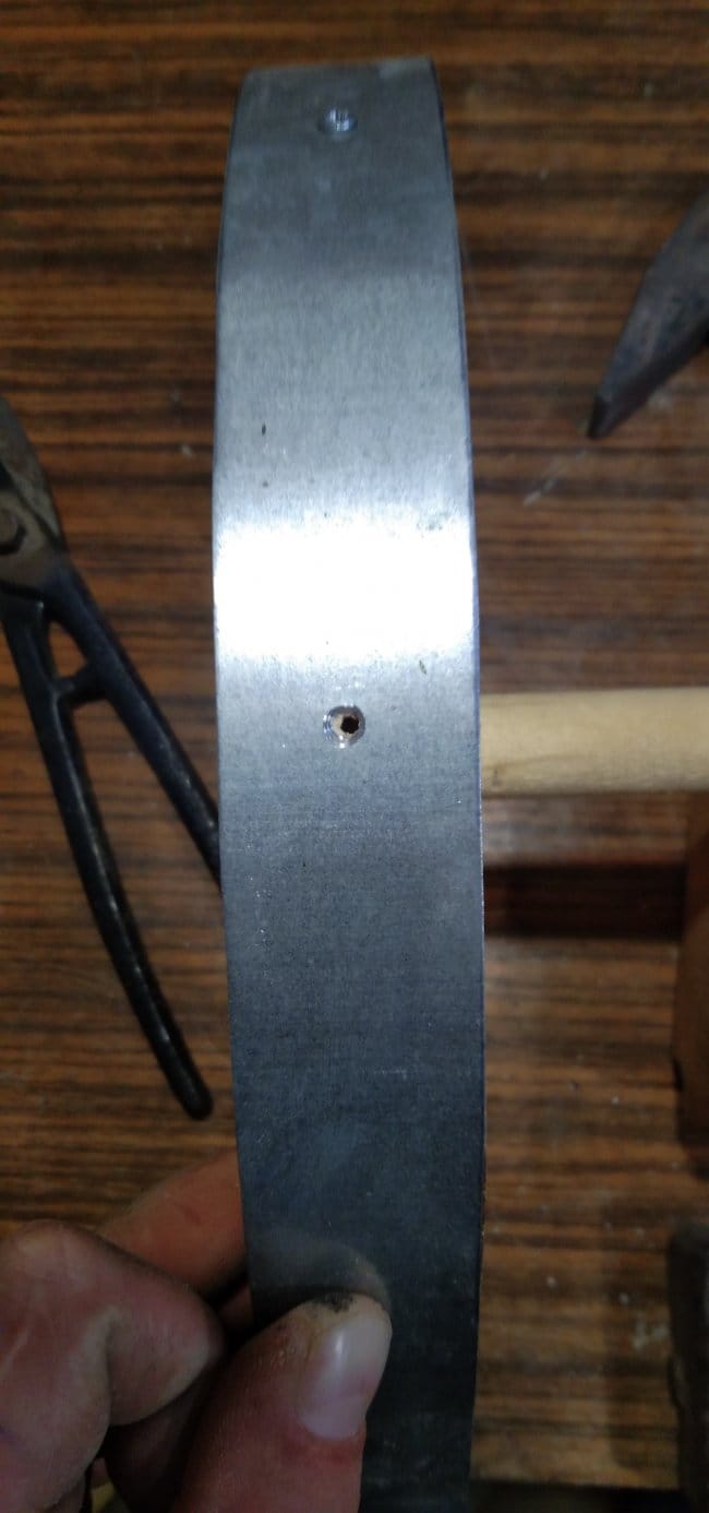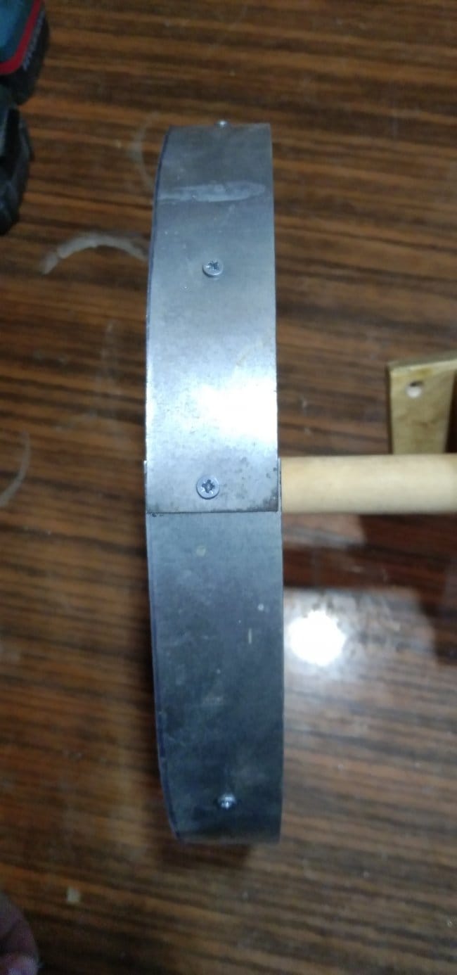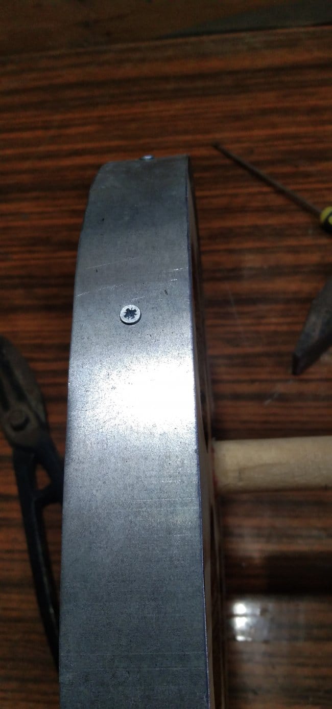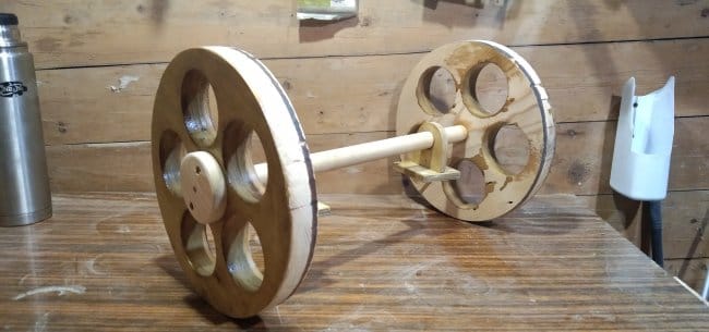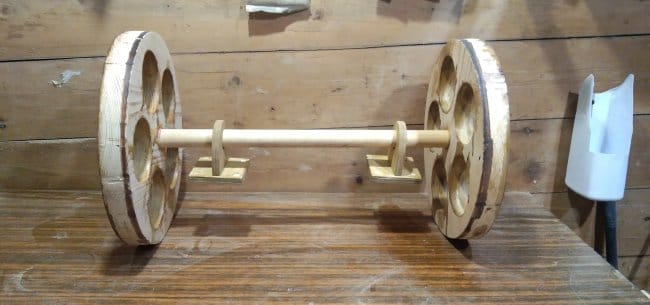 Теперь необходимо собрать колесную пару. Высверливаю сквозные центральные отверстия, диаметром практически совпадающим с диаметром оси. На саму ось надеваю детали, которые будут удерживать ось на тележке. Промазываю концы оси и отверстия в колесах столярным клеем и насаживаю колеса на ось. После высыхания прикручиваю колпачки. Т.к. колеса у меня цельные, то от погодных условий они могут растрескаться и развалиться, поэтому буду усилять их по всей окружности полосами оцинкованной стали. Полосы по толщине такие же, как и кромка колеса. Делаю отверстия и в металле, и в самих колесах и креплю полосы небольшими саморезами.