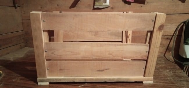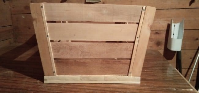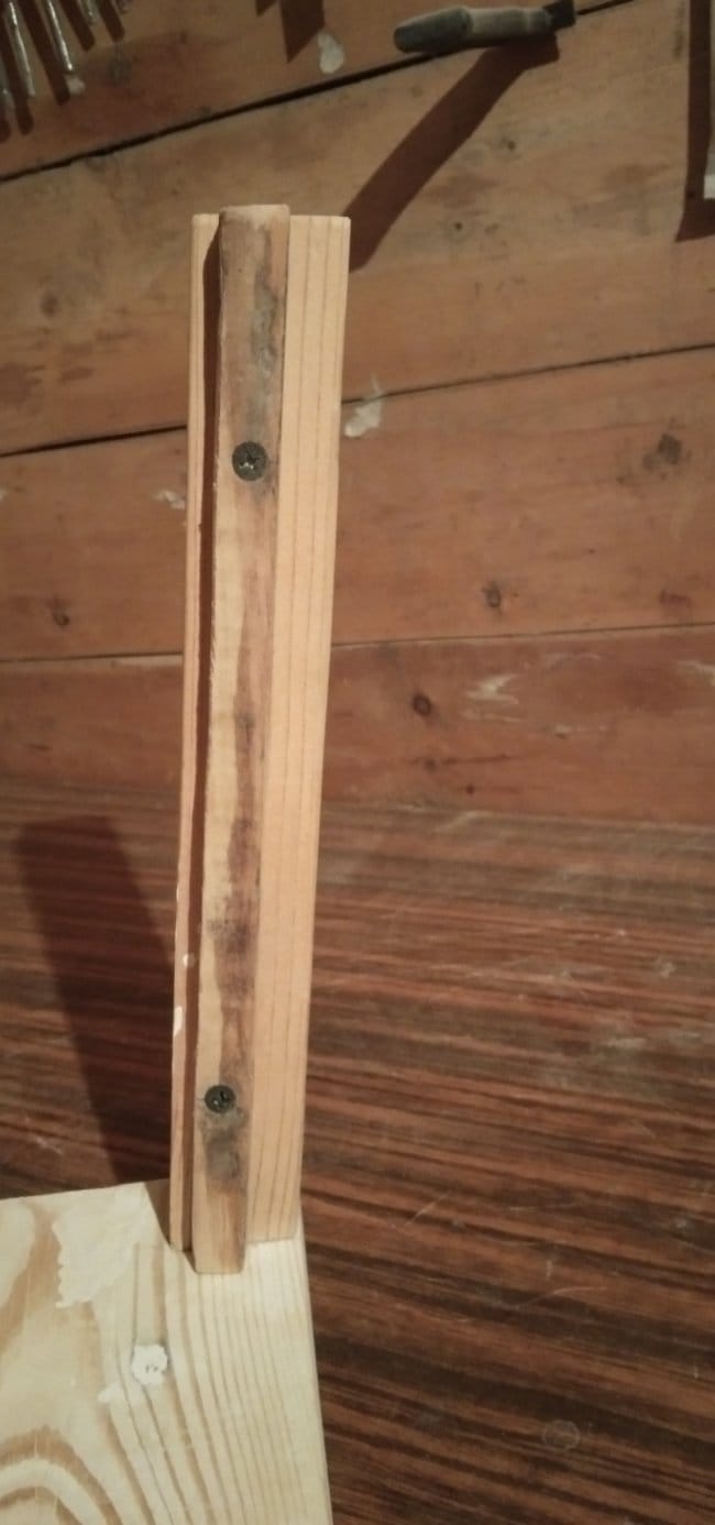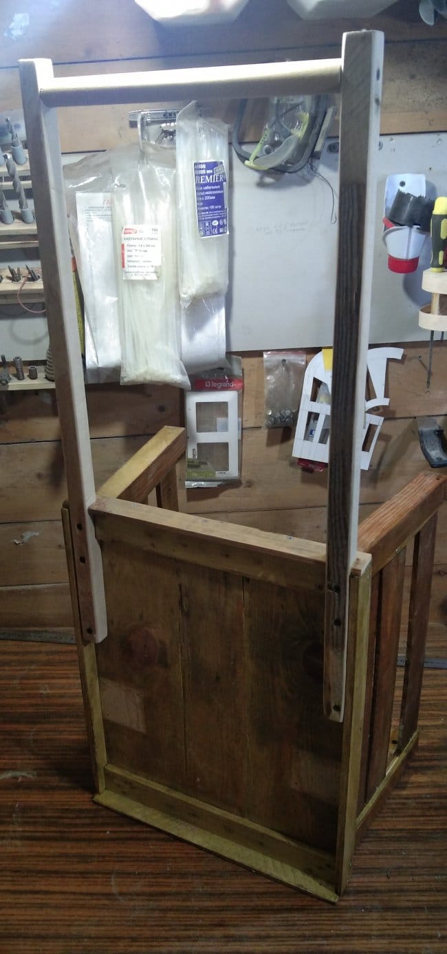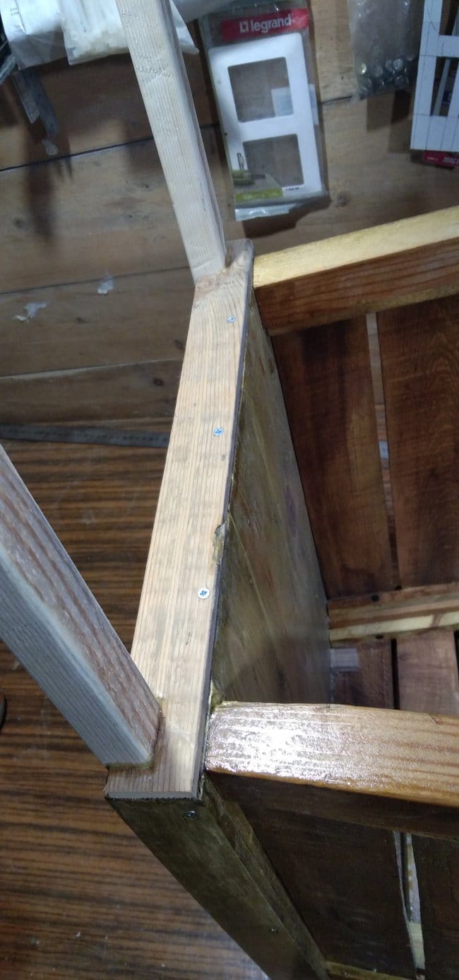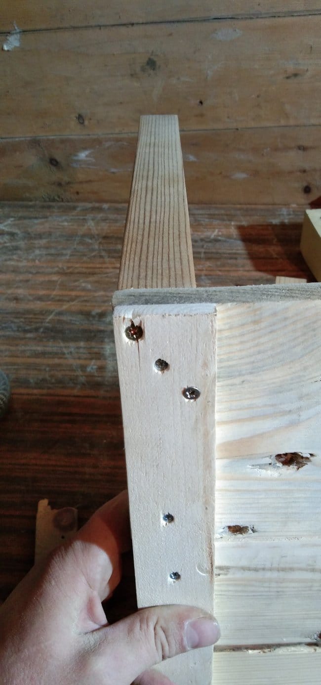 Следующий этап — это наращивание бортов на телегу. Материалом для них послужили фруктовые ящики, стенки которых были собраны из досочек примерно сантиметровой толщины. Разобрав пару ящиков и пожалуйста, материал для очередного проекта у тебя в наличии! Доски к бортам решил крепить внутри самих плеч. Так готовая телега будет смотреться намного интереснее. Чтобы не мучиться и не просверливать плечи по всей толщине, решил установить на них своеобразные ограничители, на которые уже и буду крепить сами борта. Для них использовал бруски, которые закрепил саморезами, заранее просверлив в заготовках отверстия, чтобы избежать раскалывания заготовок. Затем, взяв доски, которые идут на бортики, поочередно прикладывая их к плечам телеги, отмечал размер и угол наклона, чтобы они "заподлицо" входили в предназначенные для них места. Расстояние между досками соблюдал с помощью обрезка доски, вставляя ее между заготовками. И так на трех сторонах телеги. Передняя часть остается открытой. Затем, с наружной стороны, так же с помощью бруска, но уже несколько меньшего по толщине, спрятал места соединения бортов с плечами. Как уже писал выше, все это было закреплено саморезами. Но это не очень хороший вариант. Было бы намного удобнее и экономичнее по времени и ресурсам, если бы на тот момент у меня был строительный степлер. Но за не имением оного пришлось использовать то, что было. Так что если кто-то из прочитавших эту статью решит повторить данный проект, учитывайте это.