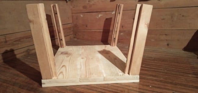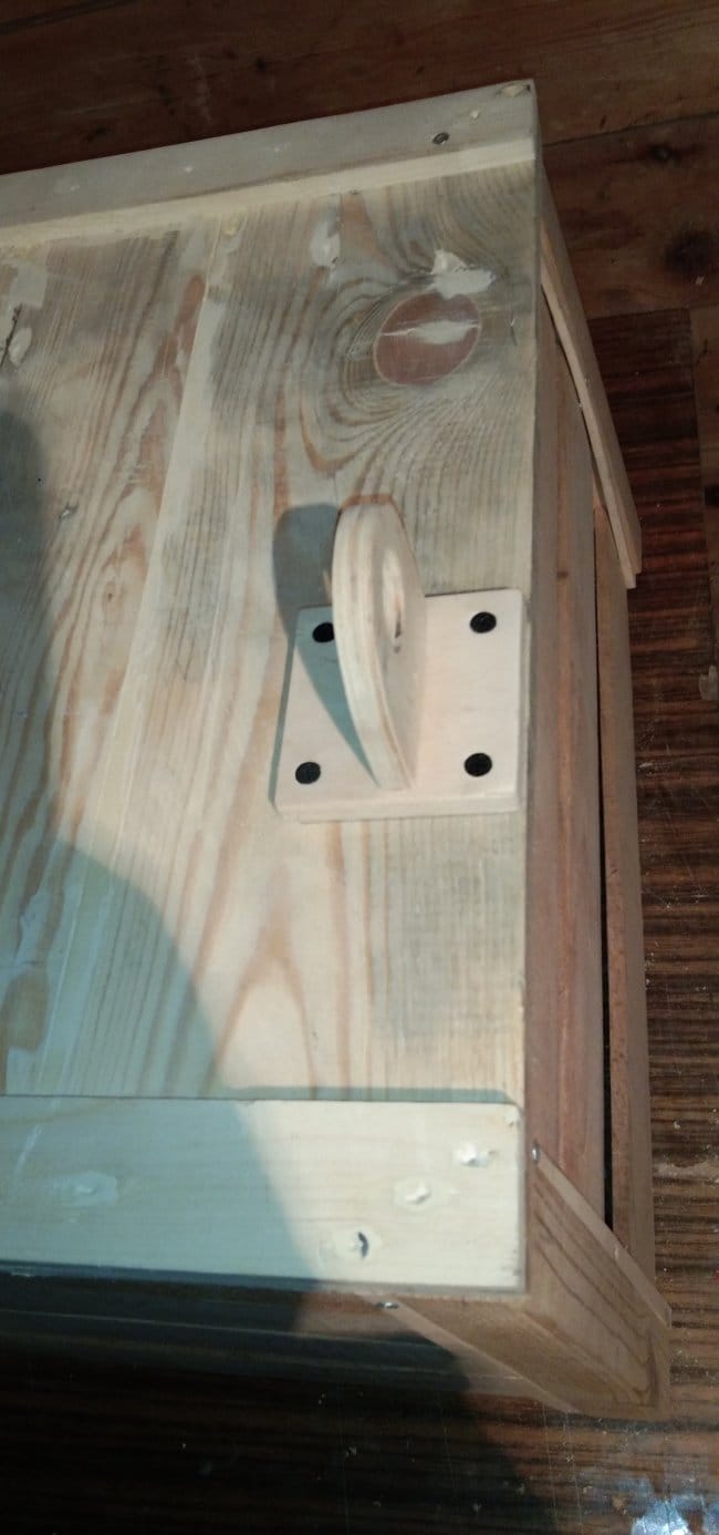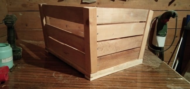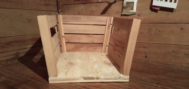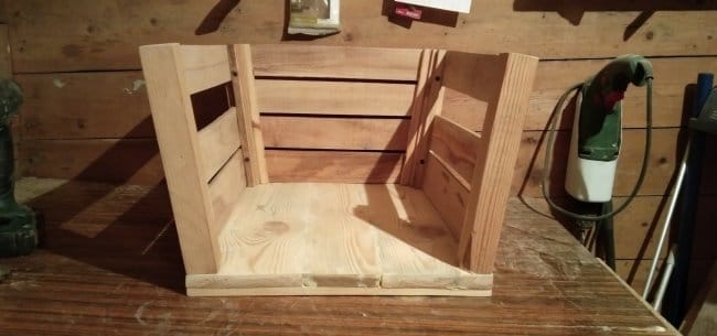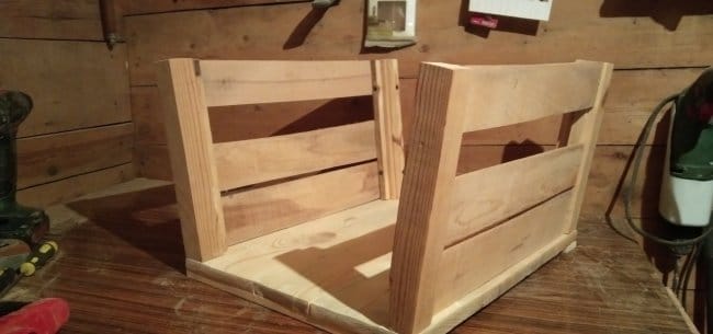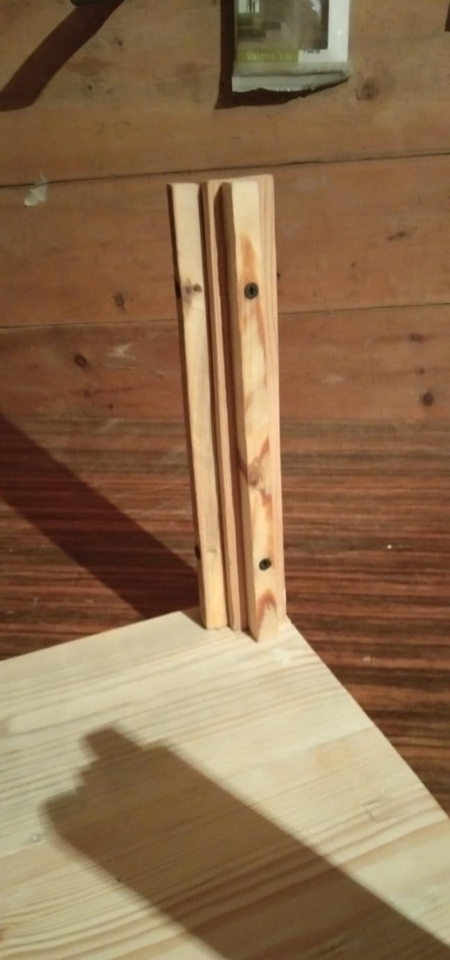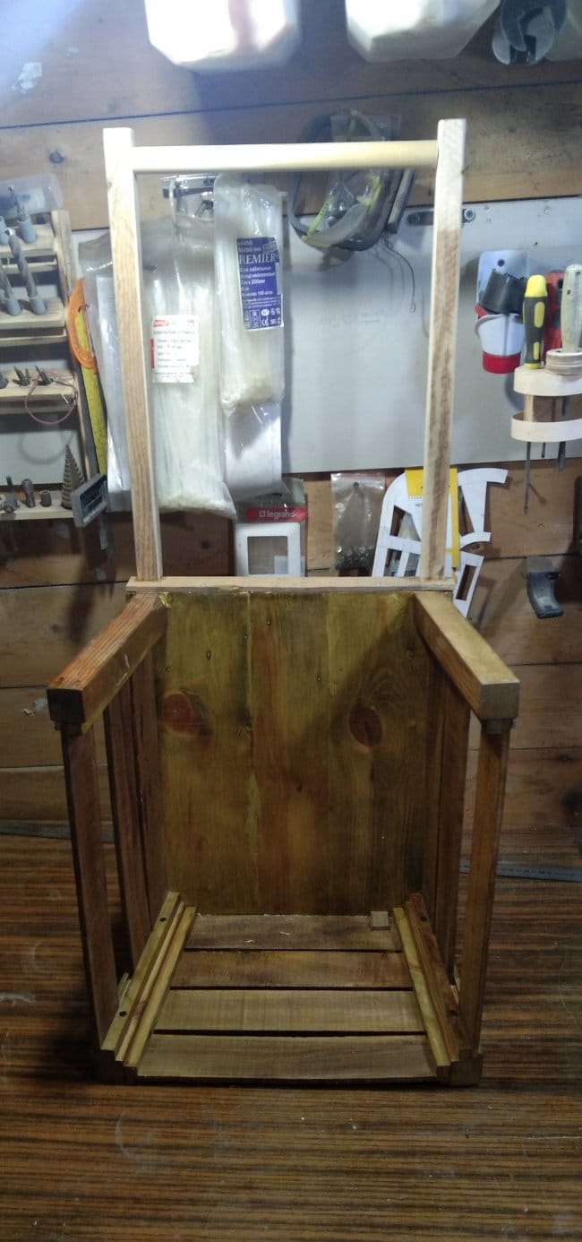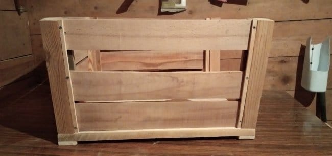 Следующий этап — это наращивание бортов на телегу. Материалом для них послужили фруктовые ящики, стенки которых были собраны из досочек примерно сантиметровой толщины. Разобрав пару ящиков и пожалуйста, материал для очередного проекта у тебя в наличии! Доски к бортам решил крепить внутри самих плеч. Так готовая телега будет смотреться намного интереснее. Чтобы не мучиться и не просверливать плечи по всей толщине, решил установить на них своеобразные ограничители, на которые уже и буду крепить сами борта. Для них использовал бруски, которые закрепил саморезами, заранее просверлив в заготовках отверстия, чтобы избежать раскалывания заготовок. Затем, взяв доски, которые идут на бортики, поочередно прикладывая их к плечам телеги, отмечал размер и угол наклона, чтобы они "заподлицо" входили в предназначенные для них места. Расстояние между досками соблюдал с помощью обрезка доски, вставляя ее между заготовками. И так на трех сторонах телеги. Передняя часть остается открытой. Затем, с наружной стороны, так же с помощью бруска, но уже несколько меньшего по толщине, спрятал места соединения бортов с плечами. Как уже писал выше, все это было закреплено саморезами. Но это не очень хороший вариант. Было бы намного удобнее и экономичнее по времени и ресурсам, если бы на тот момент у меня был строительный степлер. Но за не имением оного пришлось использовать то, что было. Так что если кто-то из прочитавших эту статью решит повторить данный проект, учитывайте это.