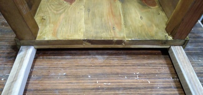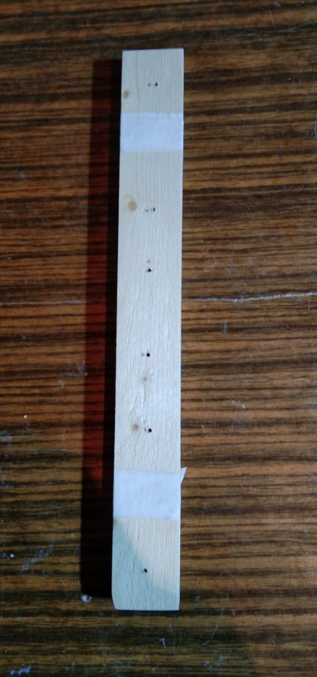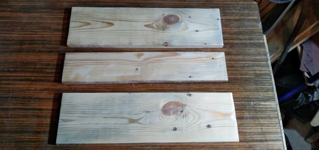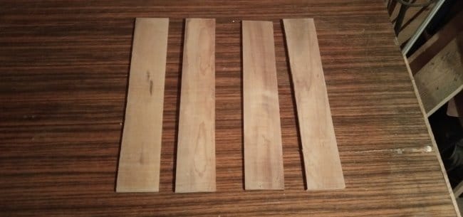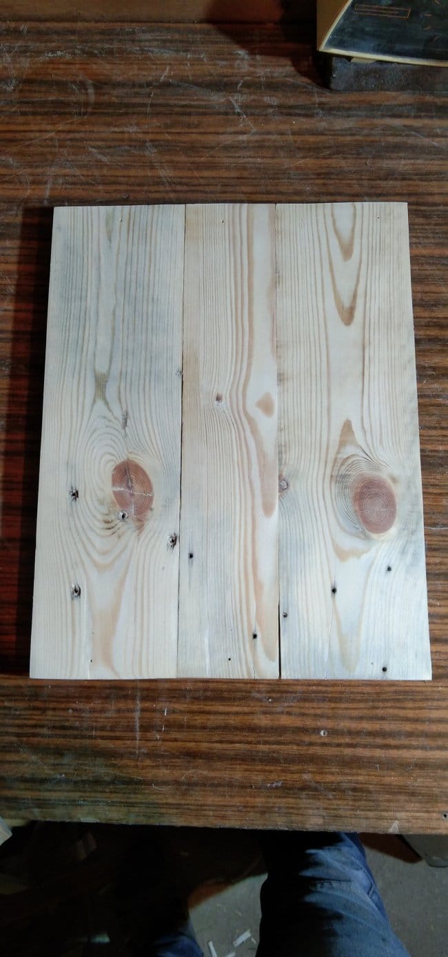 Для начала, определившись с размерами основной части изделия, были отпилены несколько досок, которые будут основой для дна. Обработал их рубанком чтобы убрать заусенцы на поверхности и с боков заготовок. Как прекрасно видно на фото, доски имеют следы эксплуатации — отверстия от вытащенных гвоздей. Но этот небольшой недостаток в дальнейшем будет легко устранен с помощью специальной шпатлевки по дереву. На этом этапе отложил их в сторону, т.к. они пока не нужны. Затем беру брусок размером 30*30 мм, отпиливаю от него 4 одинаковых отрезка и с помощью малярной ленты приматываю попарно их друг к другу. На циркулярном станке отпиливаю их с одного края под небольшим углом. Это будущие плечи, к которым будут нашиваться борта телеги. Они так же откладываются в сторону. Далее мне будет необходимо соединить доски дна между собой. Для этих целей были так же отпилены детали, в которых заранее высверлил отверстия под саморезы.