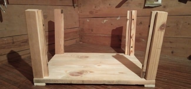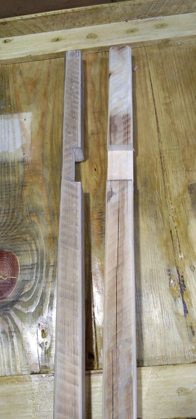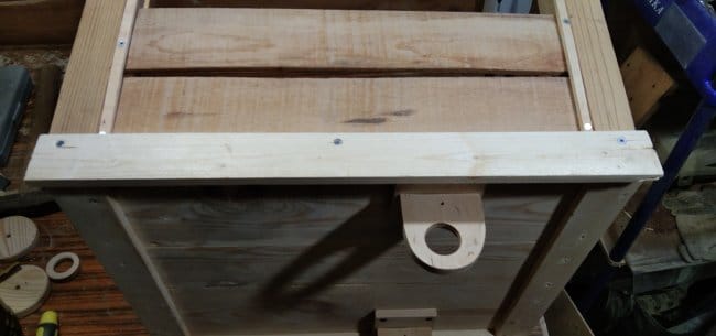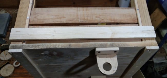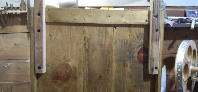 Из двух брусков делаю перекладины для ручки телеги. Устанавливаю их бо бокам, предварительно сделав пазы, чтобы они плотно прилегали ко дну днища, обтекая поперечную перемычку, с помощью которой соединены доски дна. На рукоятку идет оставшаяся часть черенка. Устанавливаю нижний бортик.
