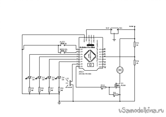 На макетной плате я разместил Ардуино, стабилизатор, резисторы , транзистор и пищалку.