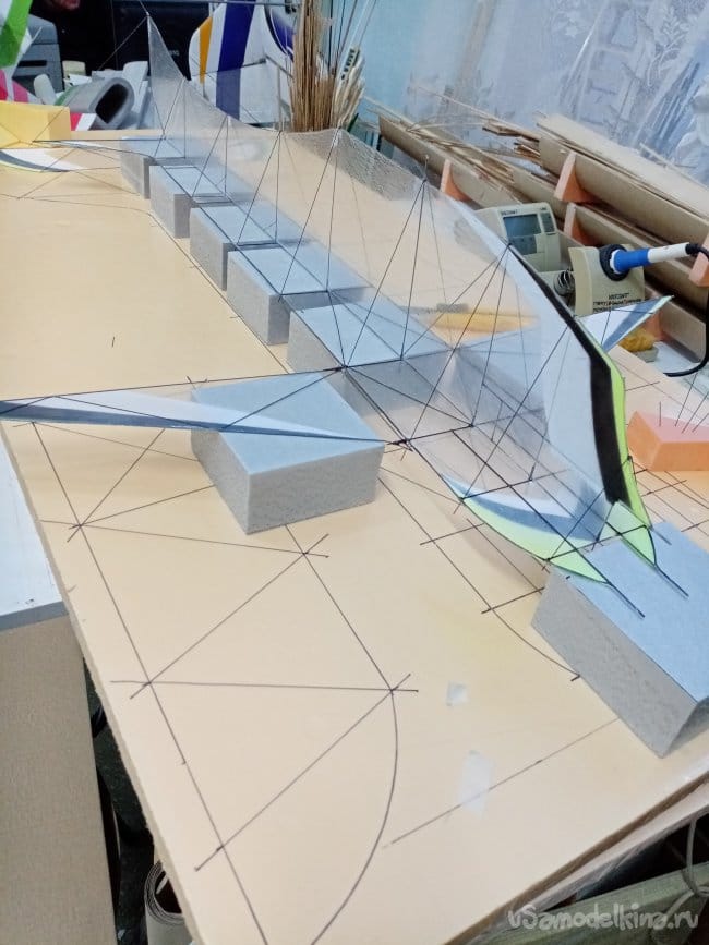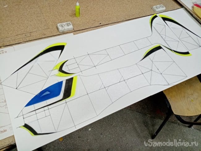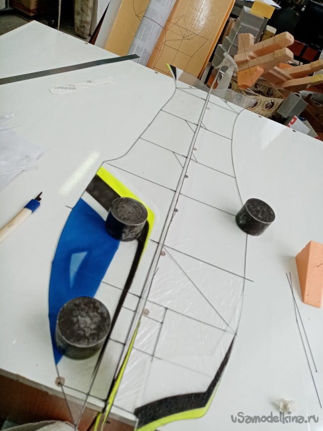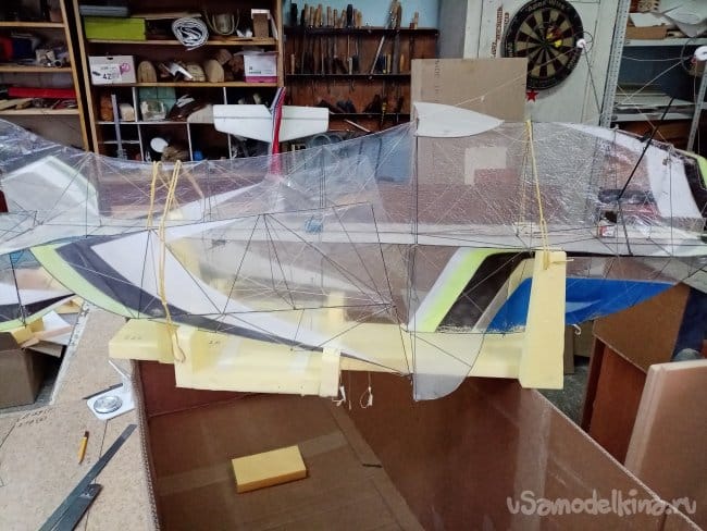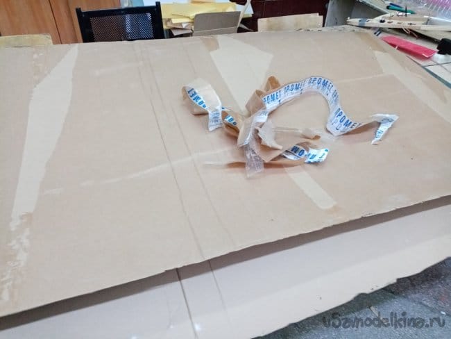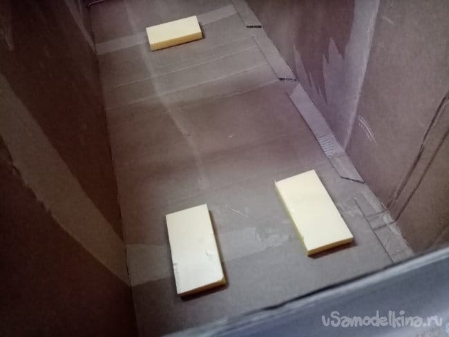 На дно коробки приклеиваю бруски пенопласта для фиксации стапеля на котором установлен самолет. Он будет съемный, для удобства ремонта и обслуживания модели во время соревнований.