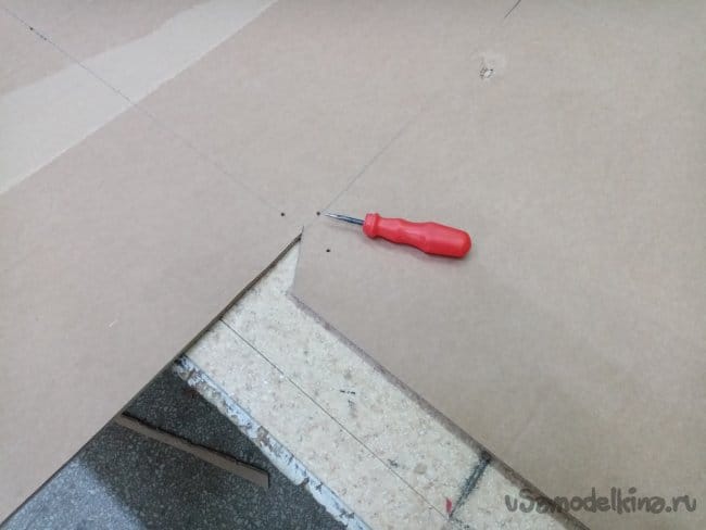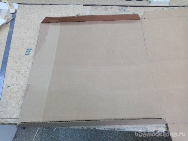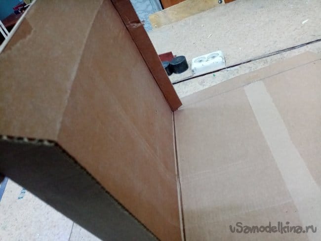 На полный размах крышки картона не нашлось. Придется собирать из кусочков. Размечаю крышку по месту.