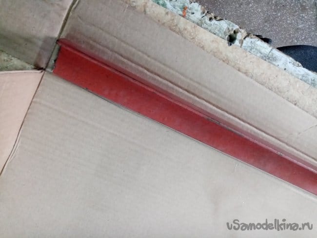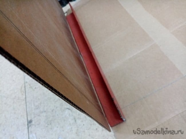 Затем нужно согнуть по линиям. Главное не допускать разрыва слоев. Для этого применяю спец-супер-прибор. Отрезок уголка металлического. Продавливаю картонку по линиям.