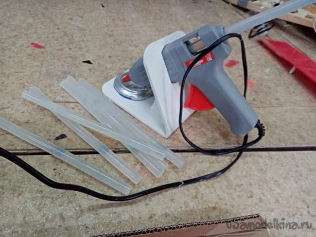 Маленькая тонкость, клей наношу на картон, поскольку есть опасность расплавления пенопласта горячим клеем.