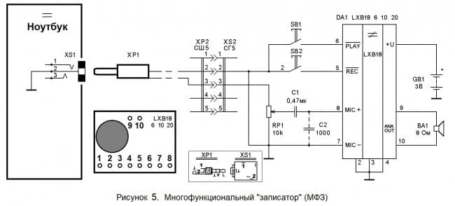 Правда, проверка модуля в режиме записи от электретного микрофона, показала, что качество записи годится только для игрушек, но никак не для скольких-нибудь серьёзных устройств. Нижние частоты модуль записывает хуже, поэтому женский высокий голос записывается лучше и воспроизводится разборчивее. После нескольких проб записи от разных источников звука, в голову пришла идея записать на модуль звуки, записанные на ноутбуке. Обычно у НБ (ноутбука) имеется один (универсальный) выход звука. Именно к нему и решено было подключить микрофонный вход модуля. Хотя до этого случая такие подключения к «неприкосновенному» НБ были табуированы (запрещены). «Разработанная» схема подключения МФЗ через кабель к выходу «Audio» НБ приведена на рисунке 5.