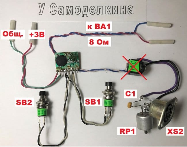 При нажатии кнопки SB2 «Record» («Запись») звучит один громкий тональный сигнал длительностью около 0,5 секунды. Если кнопка SB2 продолжает удерживаться в нажатом состоянии, то начинается запись, которая продолжается 6 секунд. По окончании записи звучат два громких тональных сигнал одинаковой длительности (0,5 с.). После этого сигнала кнопку SB2 «Запись» можно отпустить. Для включения МФЗ в режим «Play» («Воспроизведение») следует кратковременно нажать кнопку SB1. Режим «Play» также будет поддерживаться в течение 6 секунд, даже если кнопка SB1 будет удерживаться в нажатом положении. Однако, если кнопку SB1 отпустить после окончания воспроизведения, то в момент отпускания кнопки (из-за дребезга её контактов) может повторно включиться режим «Play».