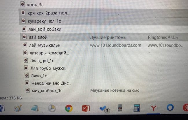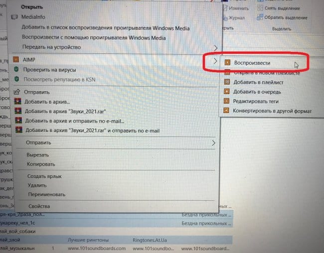 Располагаем «поднос» с макетом МФЗ поверх клавиатуры НБ. Включаем НБ и открываем «хранилище» звуковых файлов (см. рисунок 12). В авторском варианте было решено записать на МФЗ один за другим три коротких файла. Для этого мышкой или сенсорной панелью выделяем сразу три файла (см. рисунок 13). Здесь выделены тёмно-серым цветом файлы с названиями «кря-кря…», «кукареку_чел_1с» и «лай_злой». Делаем «правый клик» мышкой (однократно нажимаем правую кнопку мыши) по любому из выделенных файлов.
