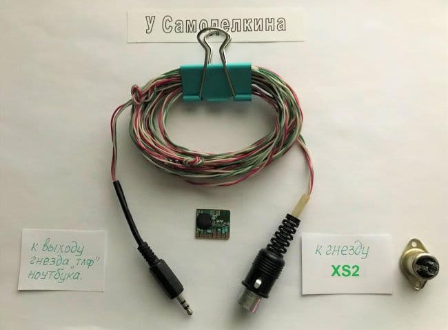 г). Самодельный кабель для подключения МФЗ к НБ. В авторском варианте кабель изготовлен не экранированным. Длина кабеля из многожильного монтажного провода составляет 3,5 метра и выбрана из расчёта возможности соединить между собой НБ и МФЗ, находящиеся в разных углах комнаты. Причём проверка записи звуков на МФЗ экранированным кабелем не показала заметного на слух уменьшения уровня шумов;