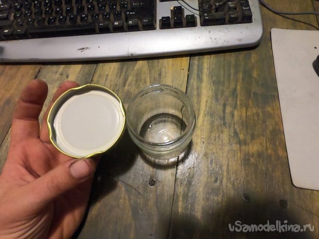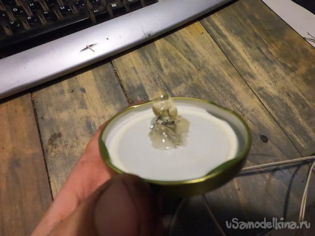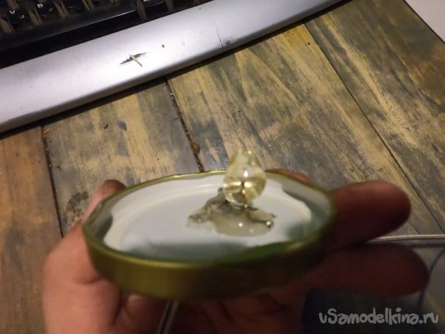 Далее в крышке банки сверлим отверстие под кабель и приклеиваем светодиод горячим клеем. Чтобы светодиод не светил в одном направлении, а рассеивал свет, я горячим клеем нарастил на нем большую такую соплю. Благодаря этой сопле свет рассеивается куда получше.