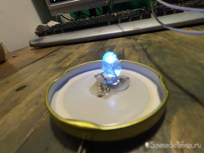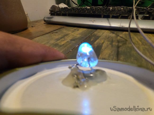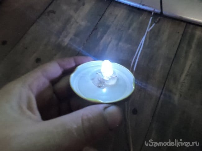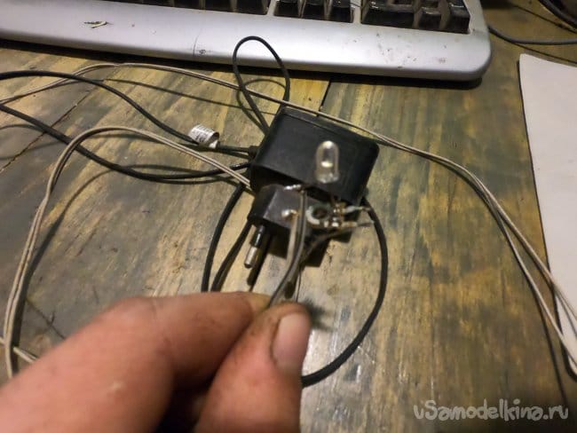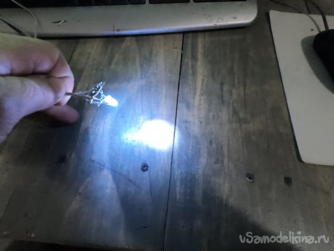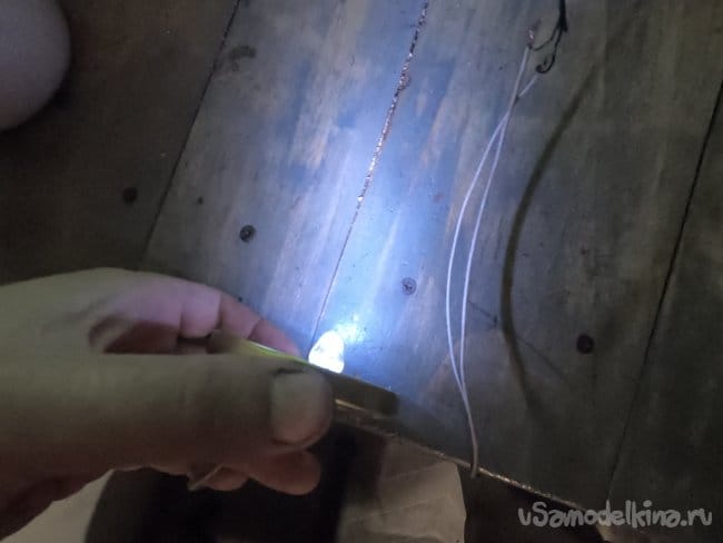 Светодиод я вытащил из фонарика, чтобы не искать к нему резистор по полосочкам и так далее, просто выпаял из старого радио подстроечный резистор и им выставил такую яркость, чтобы светодиод не горел на полную мощь.