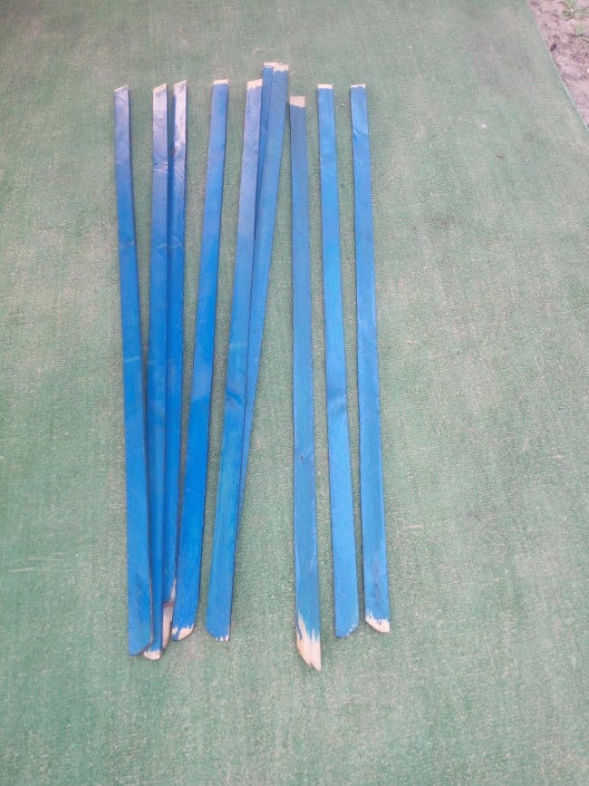 Распускаю следующую доску на четыре заготовки, но уже более подлиннее и потолще предыдущих. В верхних и нижних частях высверлил и выпилил прорези, в которые будут вставляться деревянные сетки шпалер. Нижние части слегка заострил, чтобы они более легко входили в грунт. Затем все очень хорошо прокрасил, особое внимание уделяя нижним частям, т.к. они будут находиться в земле, условиях изначально не очень хорошо влияющих на сохранность древесины.