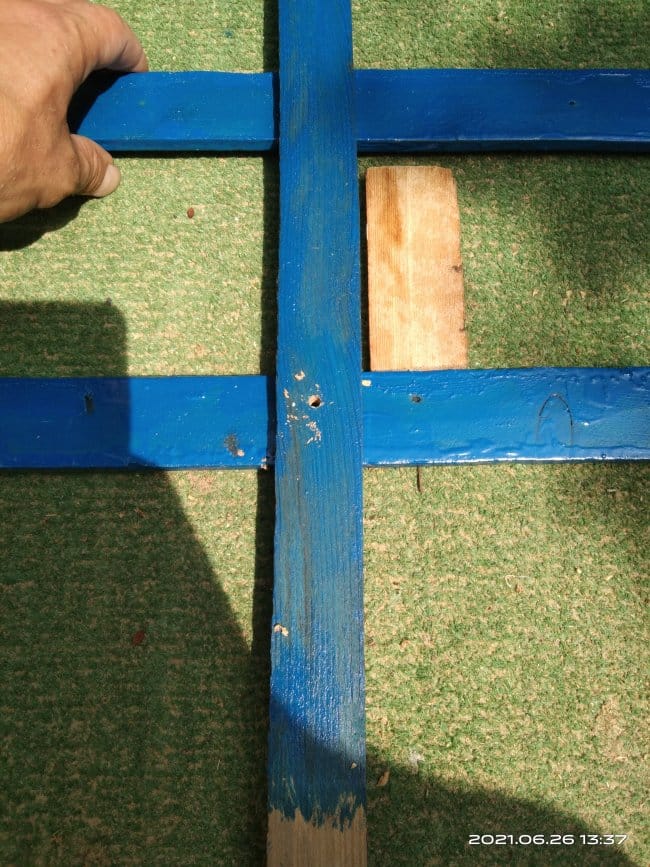 Завершающий этап — установка ножек на конструкцию. В заранее сделанные прорези вставил верхние и нижние планки сеток. В выступающих концах проделал отверстия. Это чтобы вставить в них шканты и зафиксировать сетки.