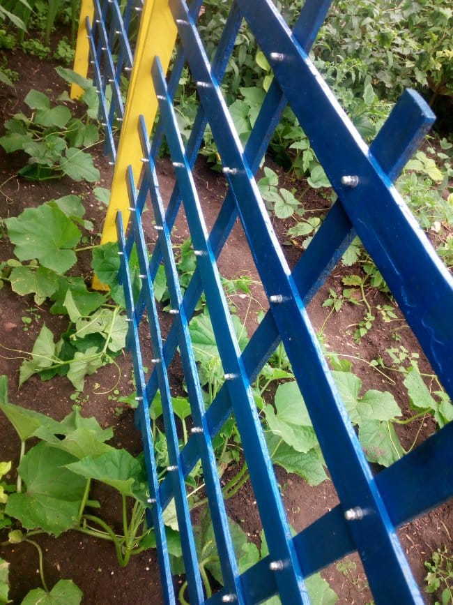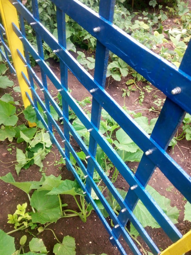 Как по мне, то преимущества очень даже очевидны! Во-первых, плети никуда не расползаются, не лезут, Во-вторых, очень удобно поливать растения. Вода сразу доносится до корней. Так же в дальнейшем было удобно собирать урожай. Все на виду и плоды к тому же чистые. Где-то неделю, может чуть более назад вытащил их из земли. Проверил ножки — краска как была, так и осталось. Гнили пока не наблюдалось. А когда в процессе эксплуатации они испортятся, то это не проблема, заменю на новые. Так что я полученным результатом доволен. Разобрал, сложил и убрал на чердак!