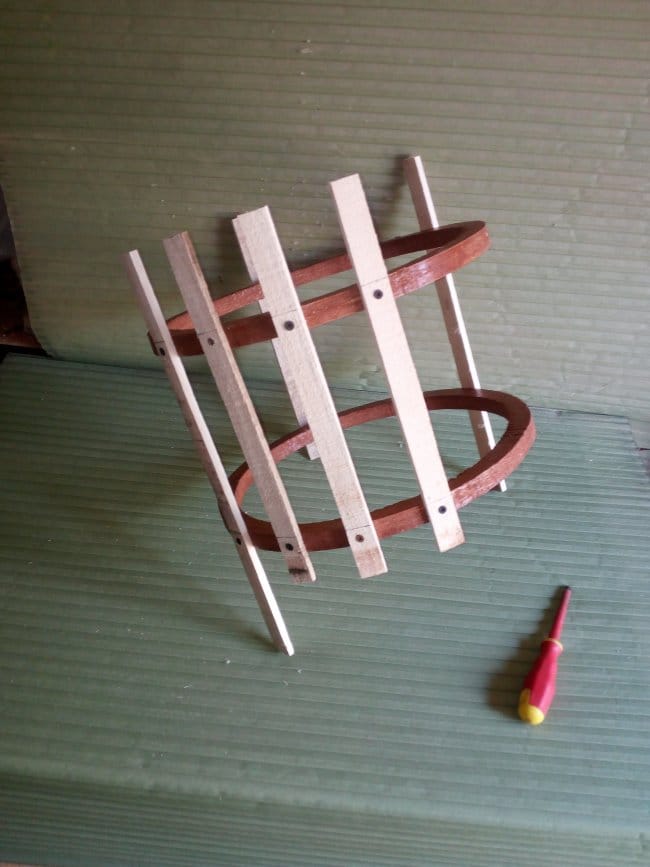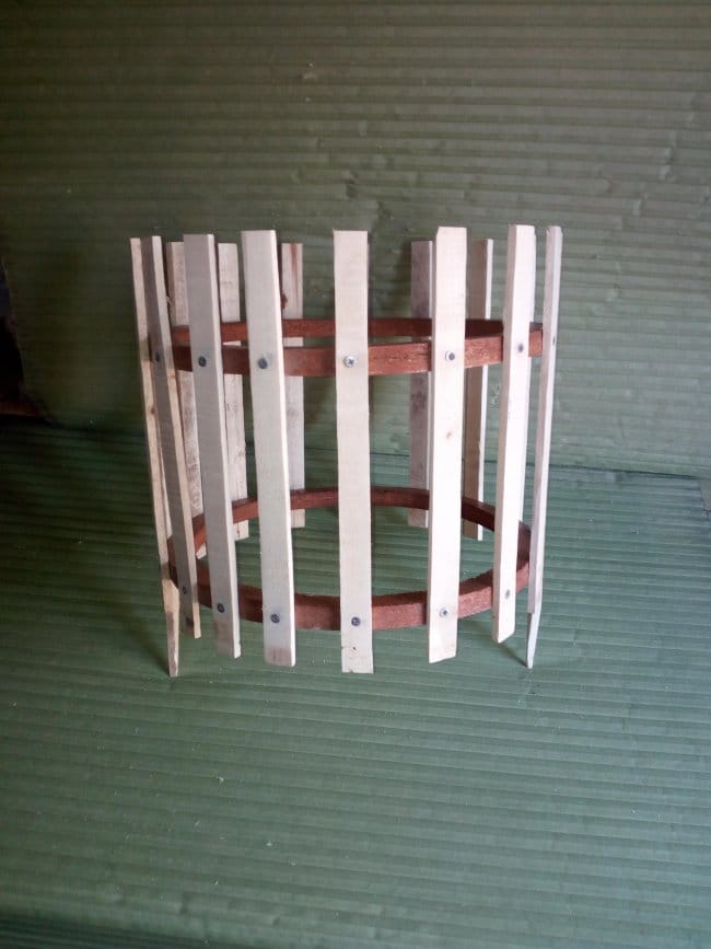 Далее высверливаю в боковинках ограждения отверстия под саморезы. По разметке начинаю прикручивать планки к кругам. Использовал саморезы 25мм. длиной. Несколько планок сделал немного длиннее, они будут заглубляться в в грунт для лучшей устойчивости. Так же заострил концы.