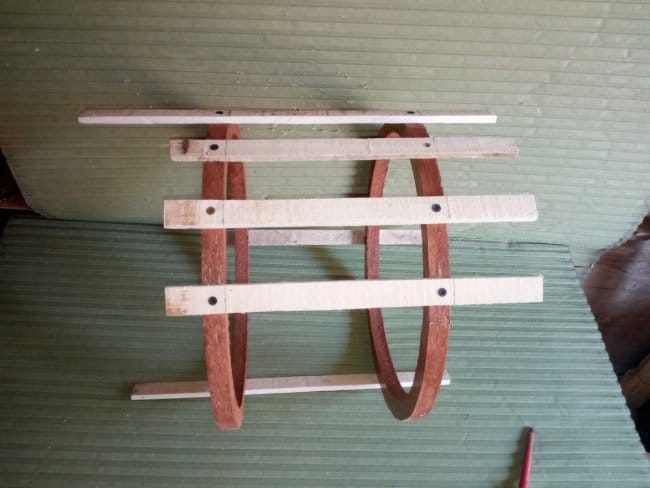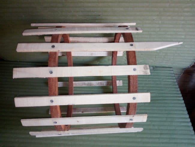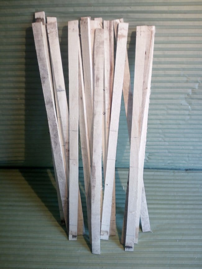 Для дальнейшей работы мне понадобились несколько деревянных ящиков от фруктов, которые я набрал на рынке. Это практически готовый материал для дальнейшего использования. Разбираю и на циркулярной пиле распускаю дощечки на нужные мне размеры. На планках делаю разметку высоты, т.е. на каком расстоянии друг над другом будут закрепляться круги и на сколько сантиметров от земли будут расположены. Да и закреплять по разметке гораздо удобнее.