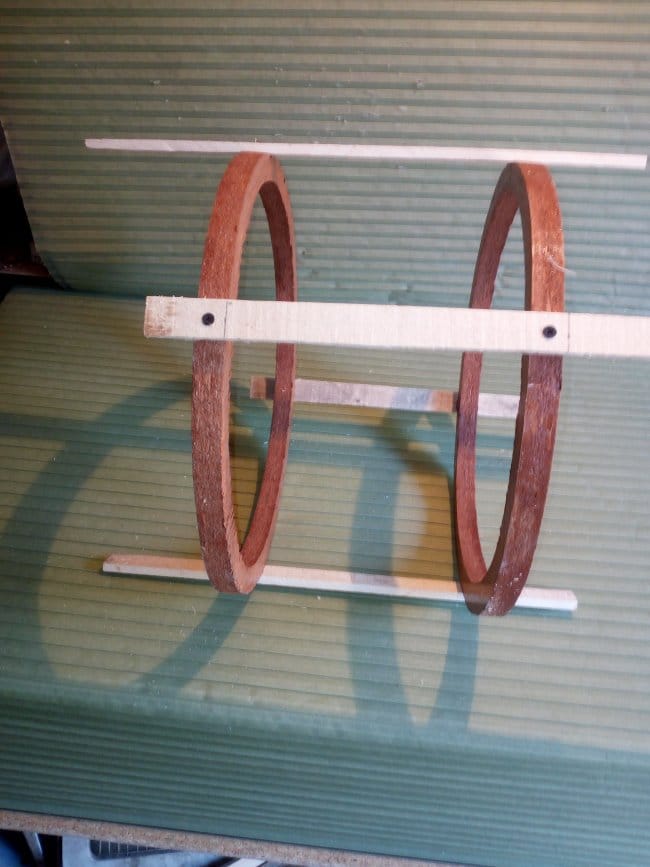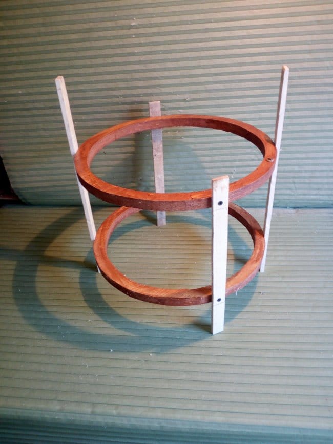 Итак, за основу, то есть круг, на который будут крепиться планки, была взята стенка от старого шкафа. Хочу сказать сразу - вариант этот не очень хорош, т.к. как ни обрабатывай, не покрывай лаком или краской он все равно разбухает. Но на тот момент у меня не было ничего подходящего под руками, поэтому взял то, что было. Циркулем начертил круг необходимого диаметра, а за тем с помощью электролобзика все это выпилил. На каждое ограждение понадобилось по две таких заготовки. Готовые части хорошенько покрыл лаком, как можно тщательнее пропитывая места пиления.