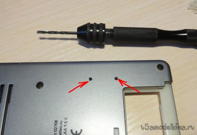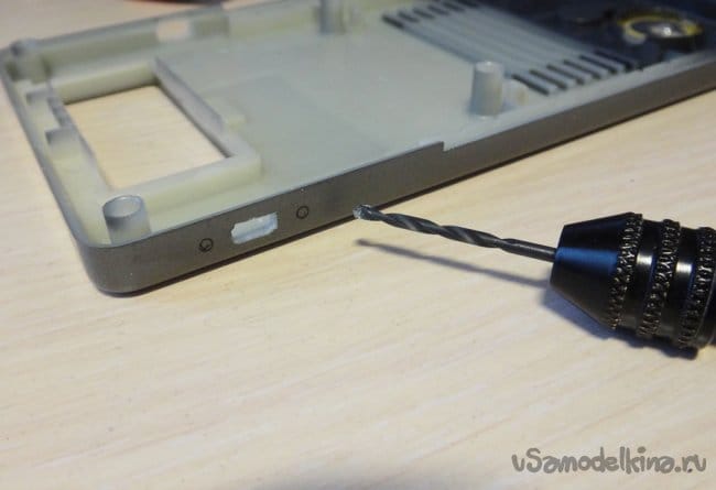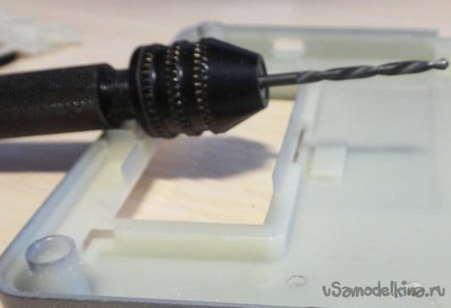 Прямоугольные отверстия под разъем и подвижную часть микропереключателя сначала рассверливаются сверлом, потом обрабатываются надфилем.