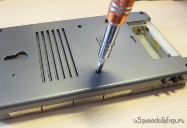 Как правило, подобные гаджеты разбираются достаточно просто: с обратной стороны есть несколько винтиков, которые нужно выкрутить.