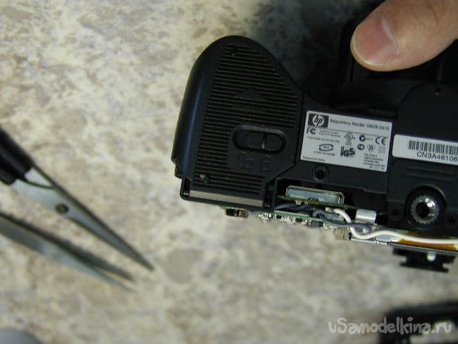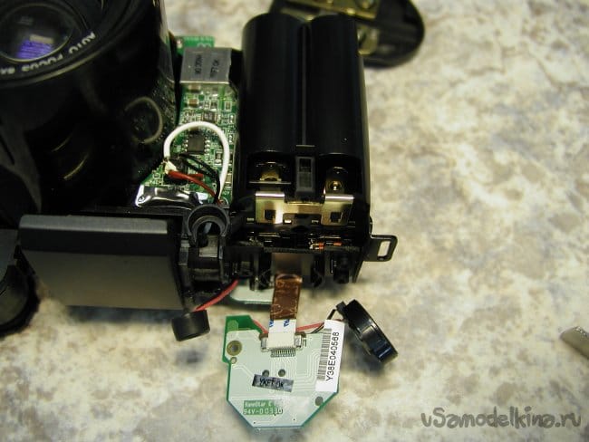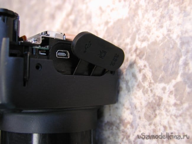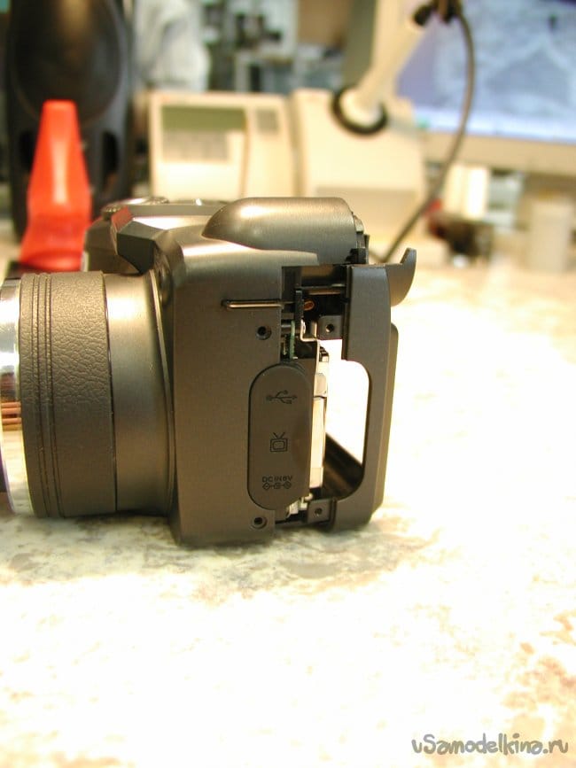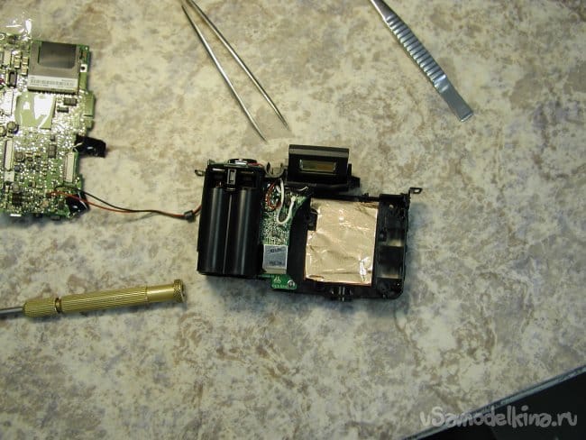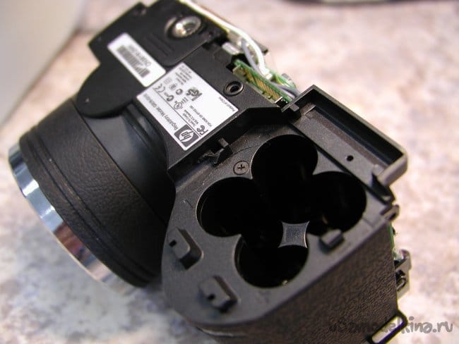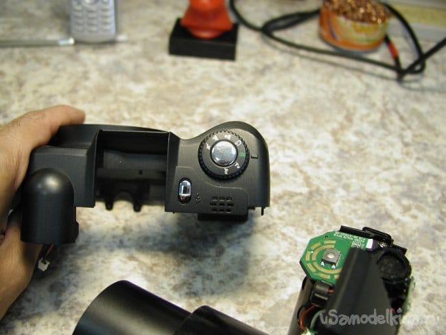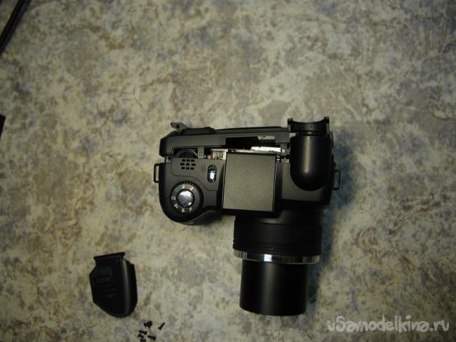 Рассоединяю панели корпуса, не забывая контролировать резинки, закрывающие внешние разъемы. Нужно приподнять немного верхнюю часть панели и аккуратно стащить вперед всю фронтальную часть корпуса. Он еще и на блок вспышки заходить. Задачка сложная для минера, могу ошибиться только раз. Ладно, проводульки оторву, не дай бог шлейф, тогда полный «абзац»
