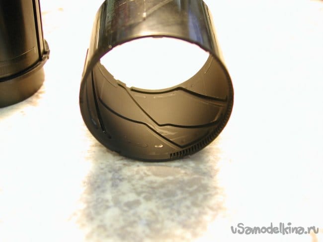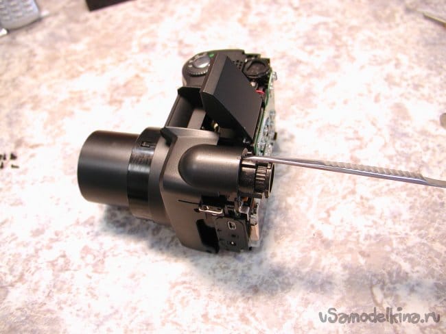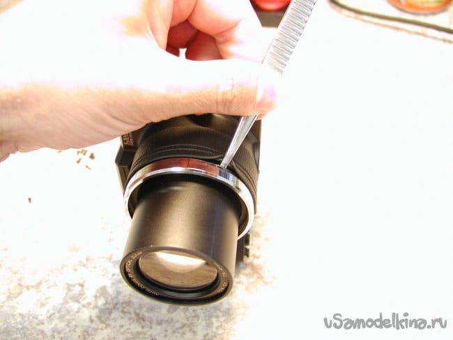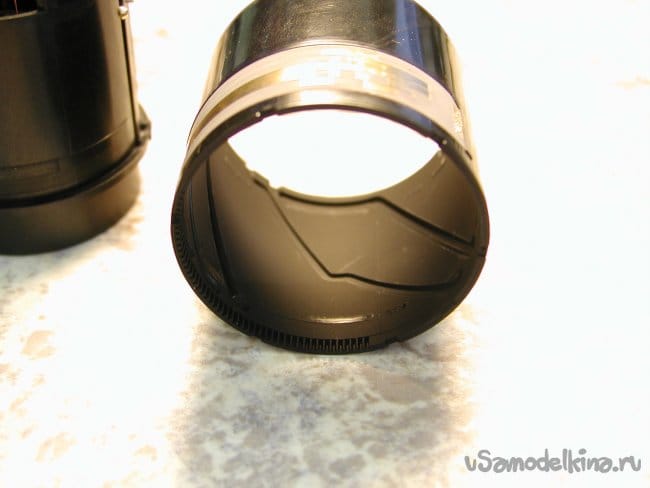Этот фронтальный корпус имеет заковыристую конструкцию, почти полностью охватывающую аппарат. Для начала решил снять резину с объектива. Оказалось не просто. Она плотно сидит на месте, нужно отделить её и стащить вперед. Сильно не растягивая.