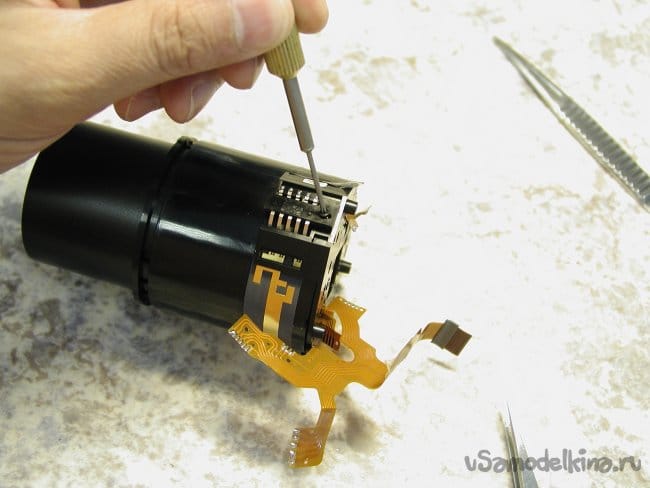 Аккуратно извлекаю последний баррель объектива, в нем установлен привод автофокуса.