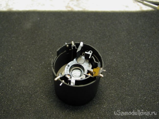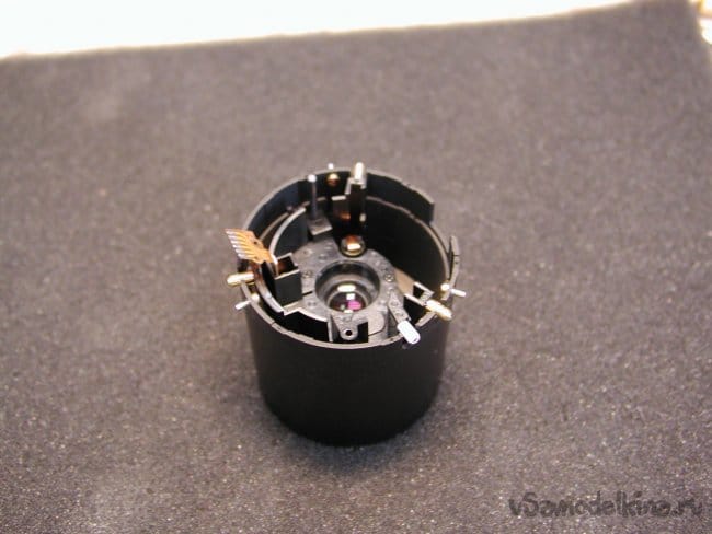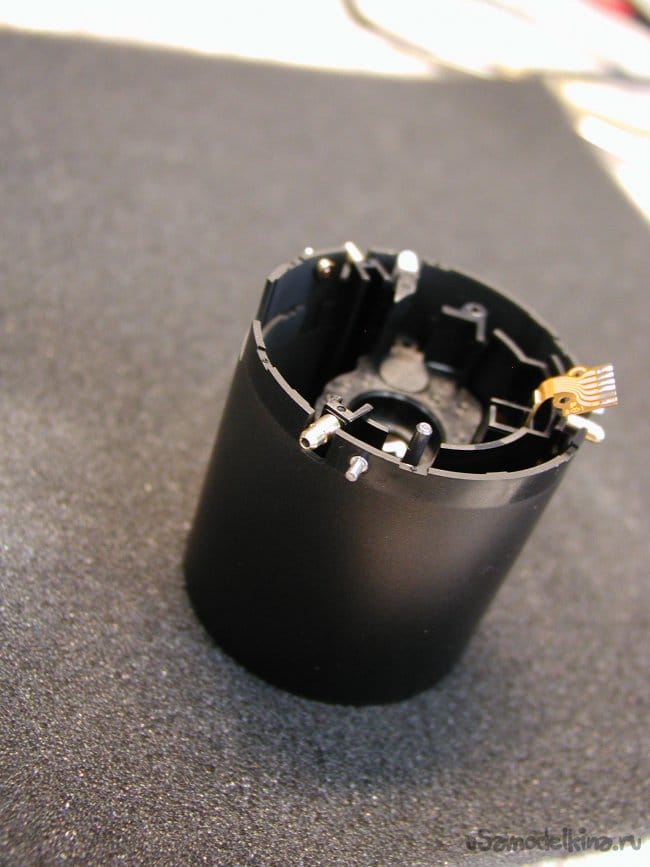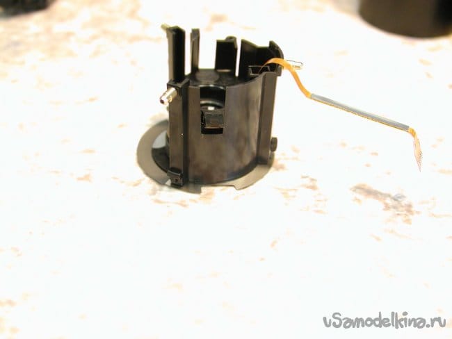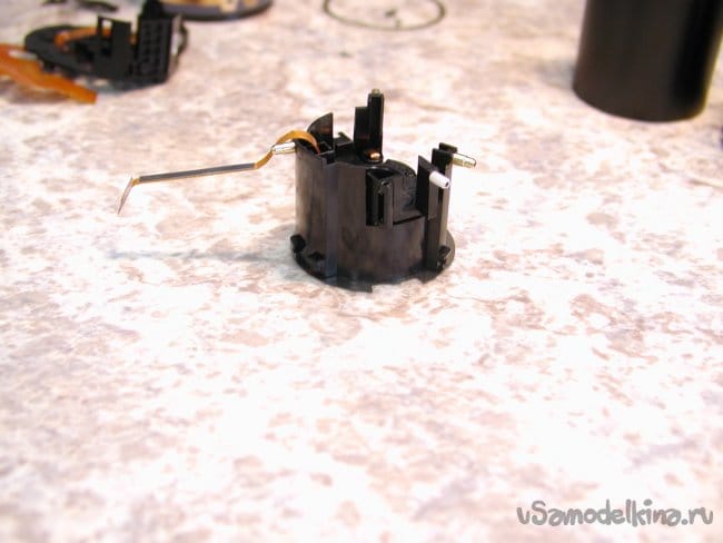 Вот и большой цилиндрик с контактным шлейфом, по которому скользит гребенка, определяя положение объектива. На внутренней поверхности видны следы пинов, заклинавших их выдирал, весьма нежно. Ничего не сломал. Пластик немного пружинит. Это мне на руку.
