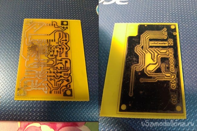 Для производства опытного образца методом ЛУТ использовалась двухсторонняя фольгированная плата. Задняя (зеленая) сторона в KiCAD печатается без инвертирования, а передняя (бордовая) сторона с инвертированием на двухсторонней глянцевой бумаге для лазерных принтеров Cactus CS-LPA4100100. Очень рекомендую эту бумагу для ЛУТ, потому что она не сворачивается и не застревает при печати, и подходит практически для любого лазерного принтера. Для печати использовался доисторический Canon LBP-810 с драйверами под Linux. Достоинством этого принтера является режим запрета экономии тонера (5 уровень подачи тонера), который я и использую. Перенос на фольгированный стеклотекстолит производится с помощью обычного бытового утюга на 2800 Вт с подложкой из отданной на растерзание нэжной пижамки жены до пожелтения бумаги. Выравнивание произвожу по напечатанным границам (Edge Cuts).