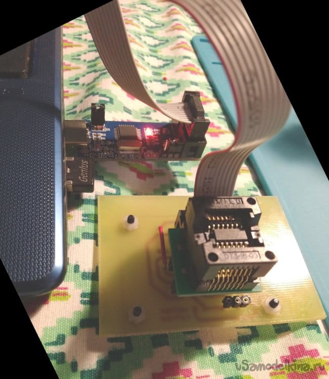 Для программирования используется китайский клон USBAsp через переходник «10 на 6». Среда программирования – PlatformIO. В ходе проверки изготовленного образца выяснилось, что я ошибся в схеме с питанием Attiny84a, поэтому пришлось разрезать пару дорожек и кинуть пару проводков. Кроме того, выяснилось, что RFM95W не дает запрограммировать Attiny84a с помощью встроенного ICSP-разъема, поэтому Attiny84a пришлось выпаивать и срочно создавать переходник для программирования на основе универсального адаптера для программирования микросхем DIP-SOIC 16 pin 150 mil. Два пина не использовались.