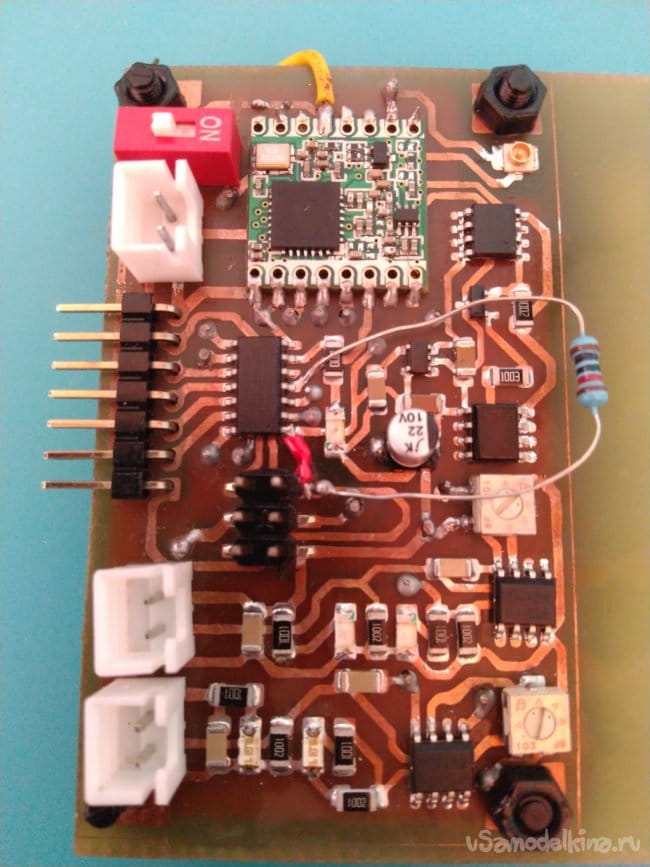 - На лицевой (бордовой) стороне: разорваны дорожки SCK и MISO между Attiny84a и RFM95W, встроены нуль-резисторы. Обрыв дорожек необходим для корректного программирования Attiny84a;