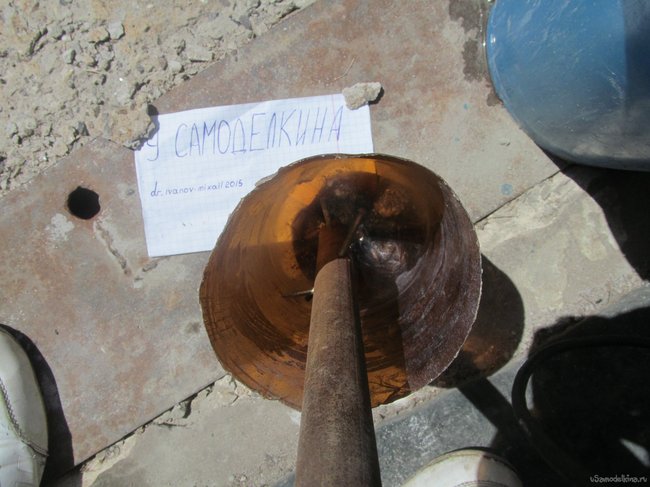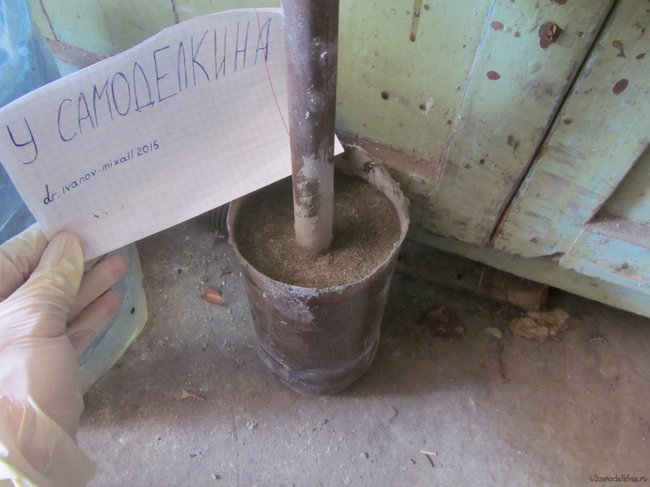 После того, как раствор готов, в бутылку по центру ставим трубу с предварительно сделанными отверстиями и вставленными туда саморезами или гвоздями, и заливаем раствором...