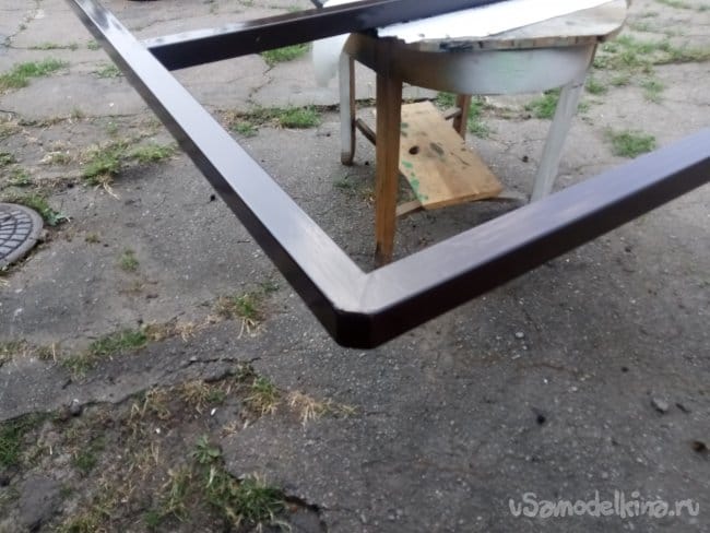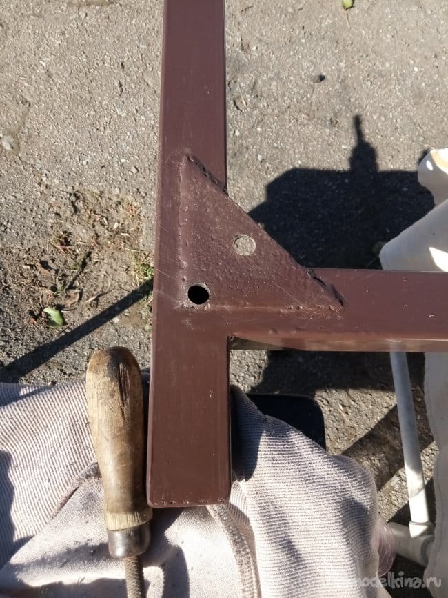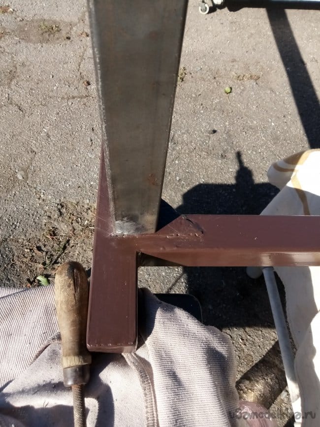Из нюансов, снизу по углам каркаса приварил косынки из листа 3мм. И на одной стороне каркаса скруглил углы, что б не ударится об острый угол. Дальше зачищаем и красим.