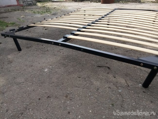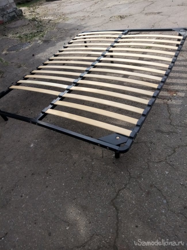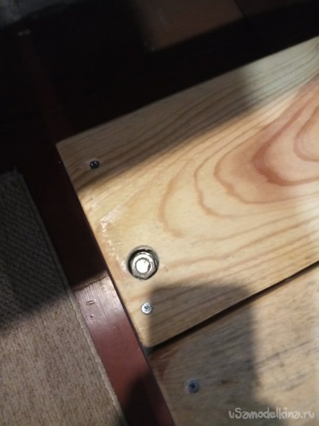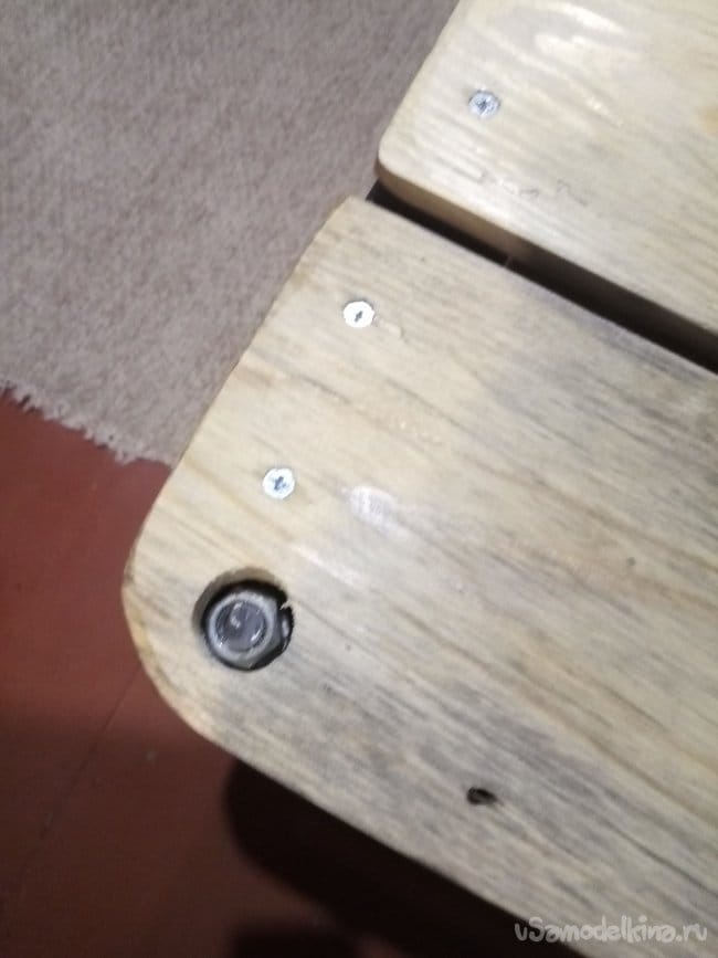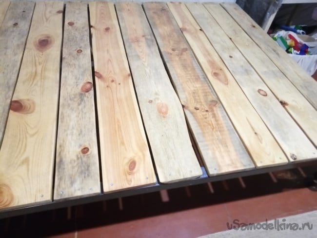 Далее берём доску толщиной 30мм, пилим ,шлифуем и лакируем, чтоб накрыть сверху каркас. Потом заносим в дом отдельно каркас, отдельно ножки и отдельно досочки. Ну и по месту всё собираем. Регулируем высоту и уровень кровати гайками на ножках. На каркасе есть четыре гайки которые выступают, с помощью пера делаем в доске отверстие под гайки. Доски крепим на саморезы и всё изделие готово к использованию