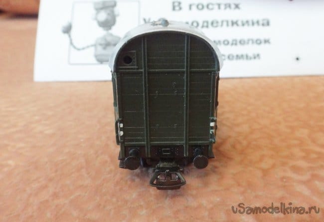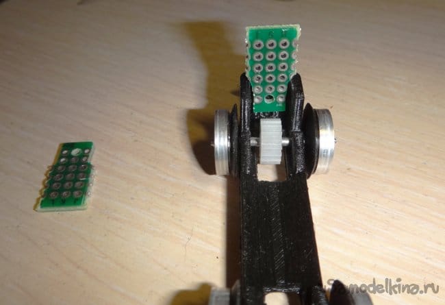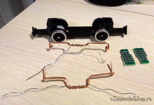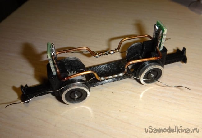В нижней части соединителя просверливается отверстие, совпадающее с ответным отверстием в торце тележки. Медная проволока изгибается как изображено на фотографии. На середине закрепляется упругая проволочка (или латунные полоски) так, чтобы концы ложились на колеса и слегка к ним прижимались.