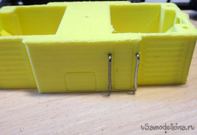 По бокам кабины нужно установить поручни – справа и слева от дверей. Поручни делаются из скрепки, которая сгибается буквой П. Ножки буквы П должны иметь высоту 2 мм, а ширина верхней перекладины должна быть равна вертикальному расстоянию межу отверстиями справа и слева двери кабины. При необходимости отверстия можно развальцевать шилом. Поручни должны плотно войти в пластик.