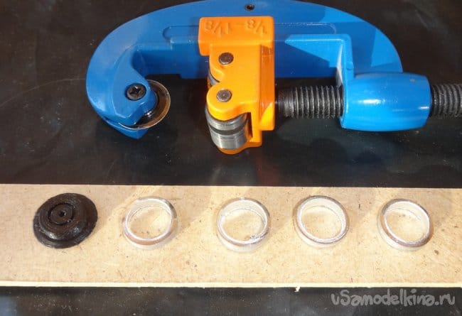 - отрезать от трубки 4 кольца одинаковой толщины 2.5-3 мм. Вместо алюминия можно взять трубку из другого токопроводящего материала. Важно точно и аккуратно отрезать одинаковые кольца;