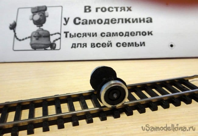 - надеть второе колесо на другой конец оси и выровнять расстояние между колесами так, чтобы они становились на рельсы и свободно по ним катались.