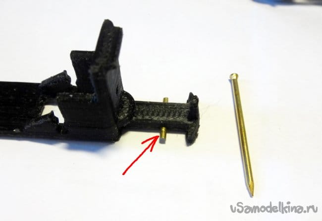 От скрепки или тонкого гвоздя откусываем шпильку 9-10 мм, которую затем плотно вставляем сбоку в основание сцепки.