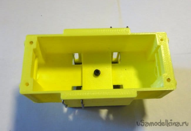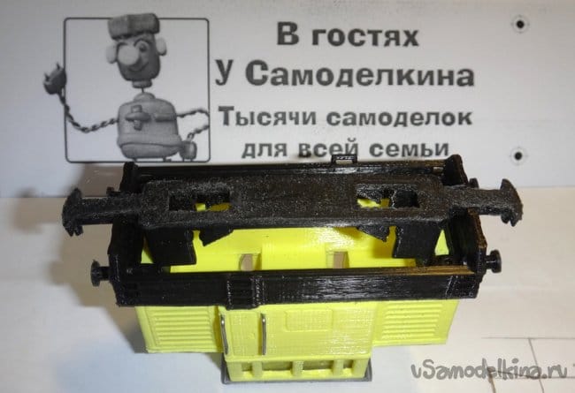 На фото можно заметить, что тележка с двигателем отличается от модели. В модели проведена доработка – доделан зацеп к корпусу, чтобы тележка фиксировалась внутри корпуса без клея и крепежа.