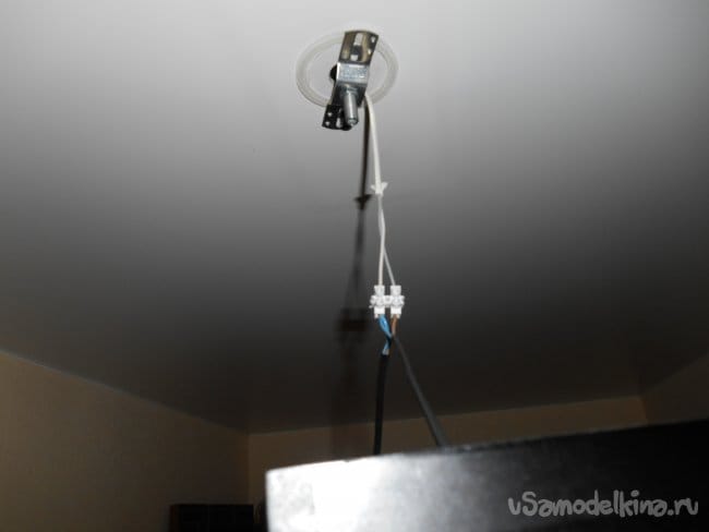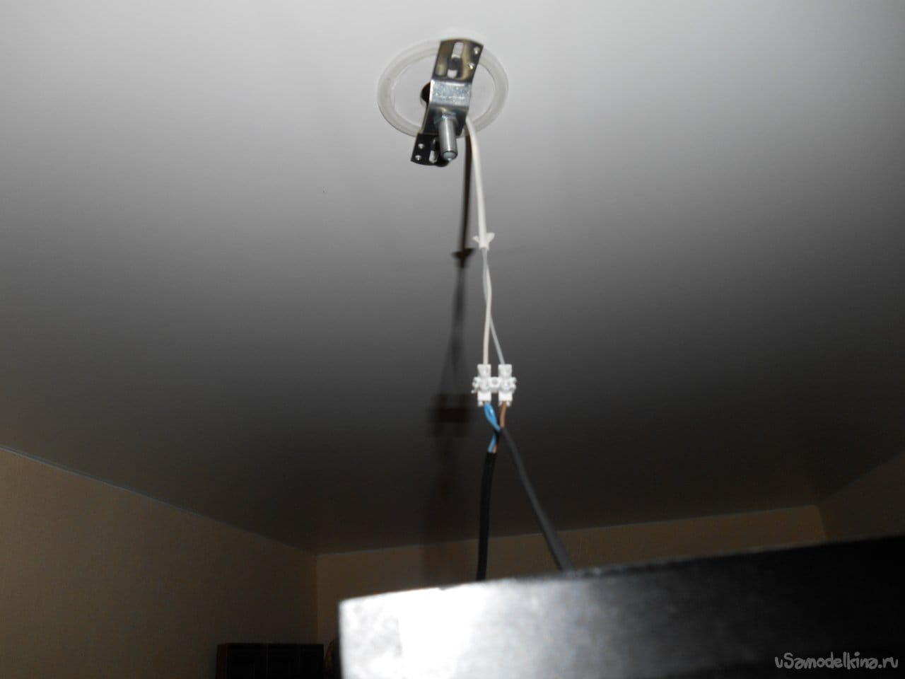 Прячу их за навесной потолок и навешиваю светильник на крючок.
