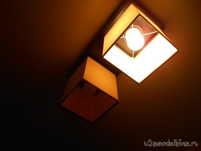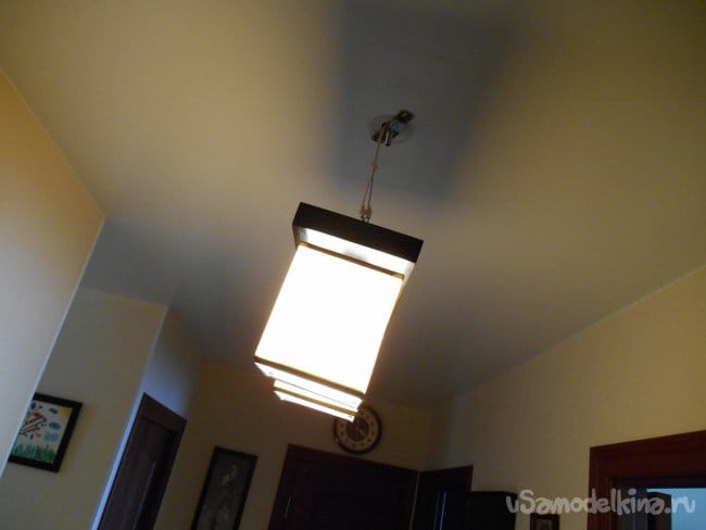 Все горит и светится. Можно подвешивать на место. Монтирую на светильник чистые плафоны. И опять лезу на табуретку.