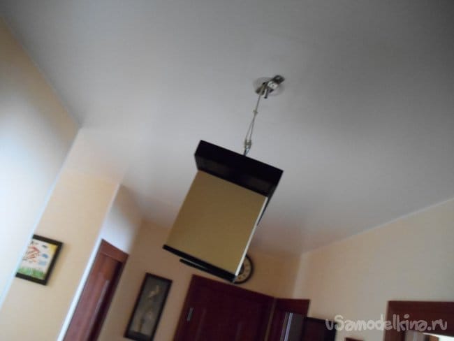 Потолок натяжной, поэтому максимально осторожно машу отверткой. Снял конструкцию с крючка, все повисло.