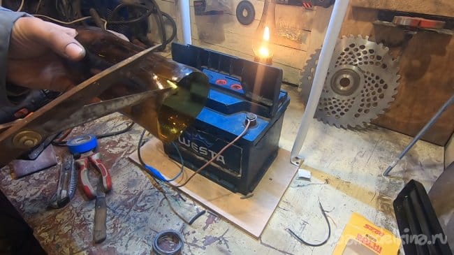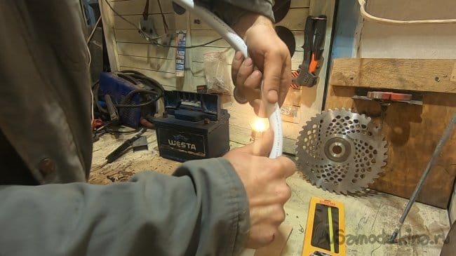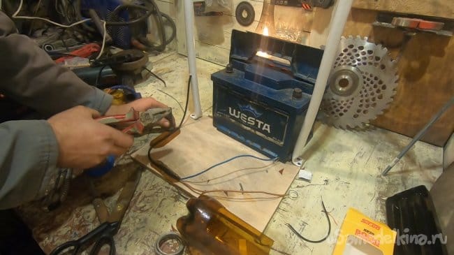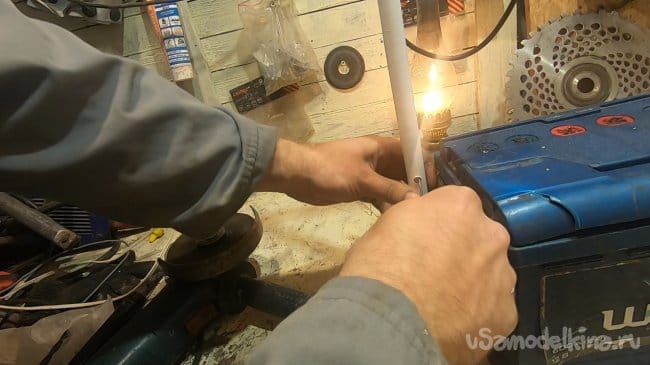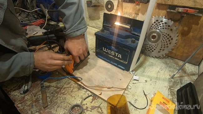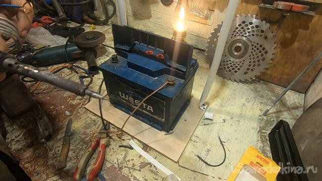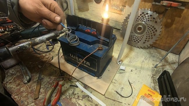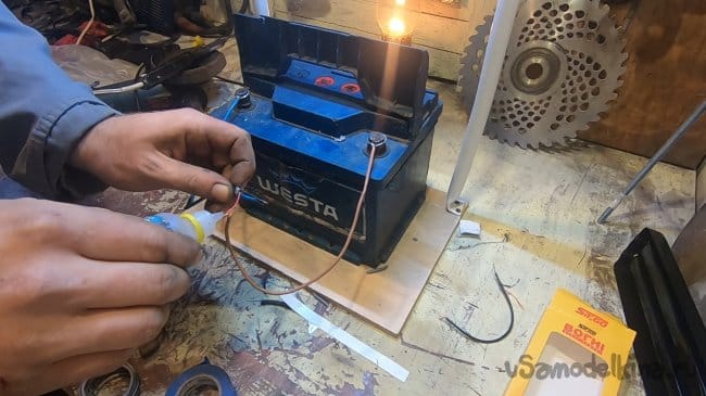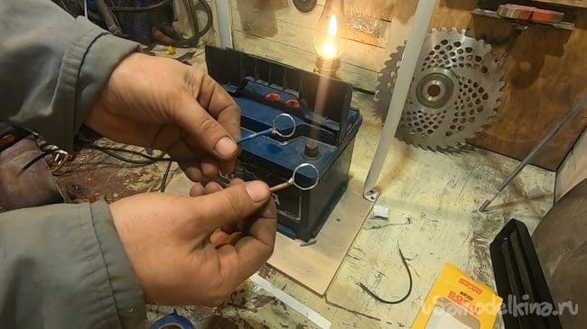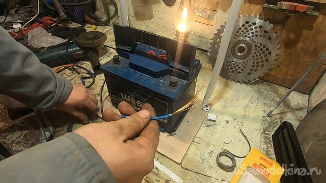 Делаем простые клеммы, которые будем накидывать на выводы аккумулятора. Тут я использовал многожильные провода коричневого цвета под плюс и синего под минус. А можно просто сделать провода разной длины, чтобы не рассматривать цвета при подключении, ну или завязать узелок на «плюсе».