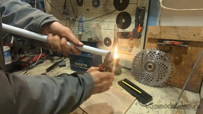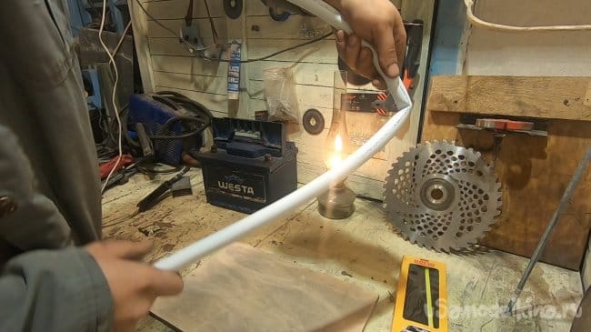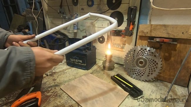 Отрезаем нужный кусок трубы из металлопластика и сгибаем в виде буквы «П». Трубу заламываем на перегибах, в итоге все получается компактно, и имеем прямую линию для приклеивания планки ДХО.