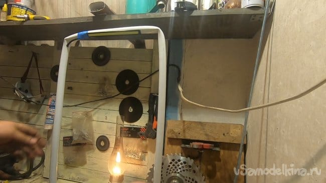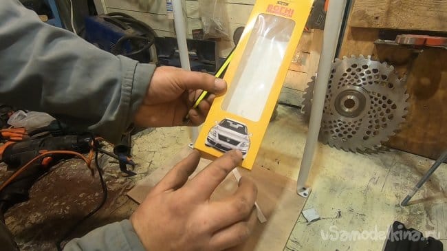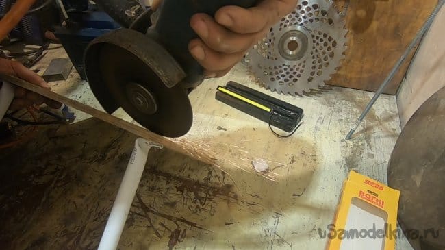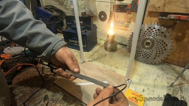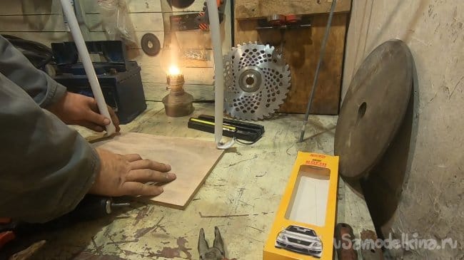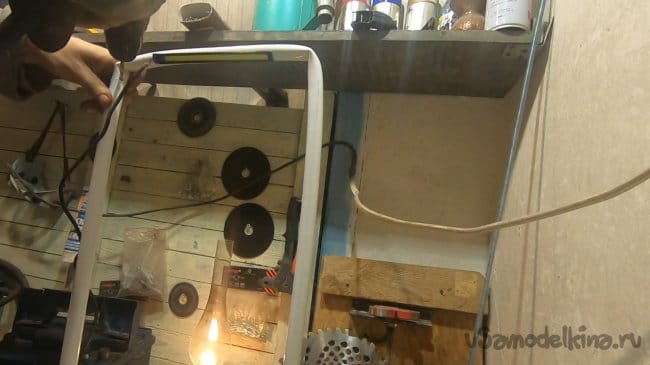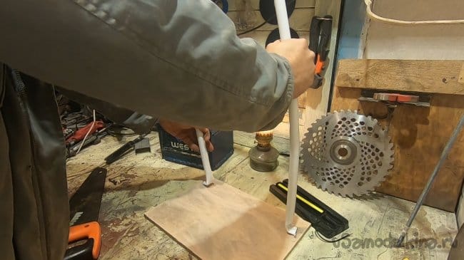 Сгибаем края трубы, выравниваем, лишнее отрезаем, чтобы конструкция стояла ровно. Ну а далее берем саморезы и прикручиваем трубу к фанере. Саморезы вылезли на ту сторону, но это не проблема, можно их срезать болгаркой.
