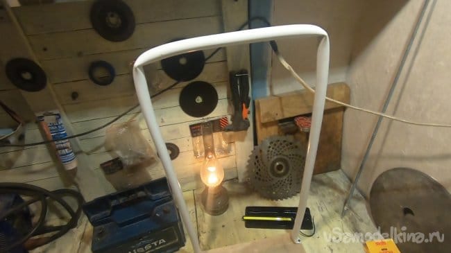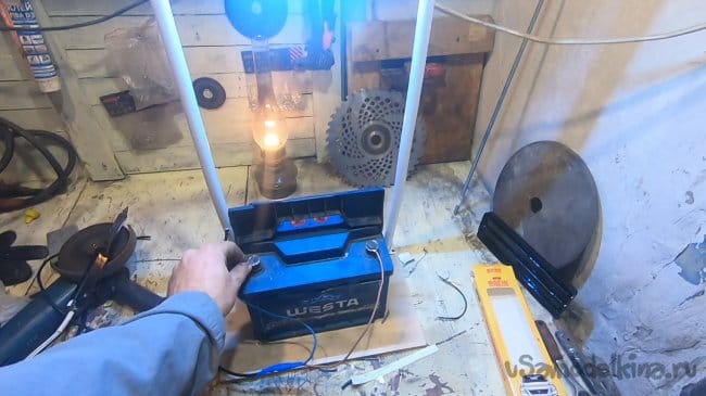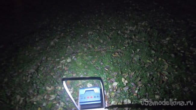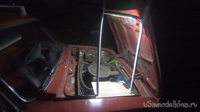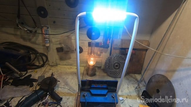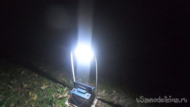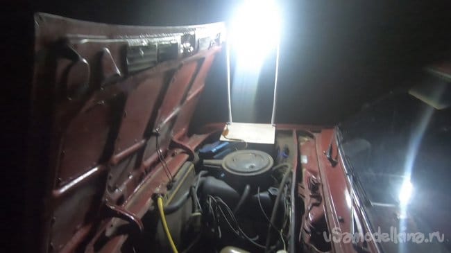 Светильник готов, можно ставить на стол, на землю или любое другое место на ваш вкус. Можно также подсвечивать подкапотное пространство, ставить при этом аккумулятор на подставку не обязательно. Светит ярко, не особо слепит, но видео это досконально не передаст.