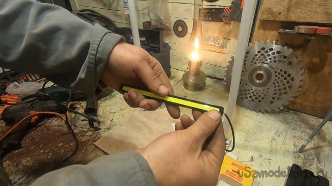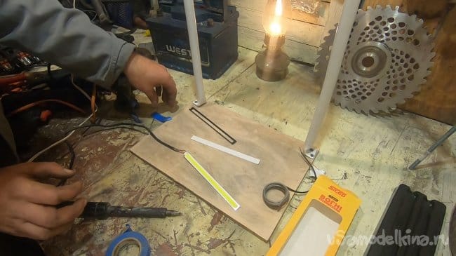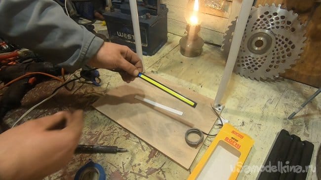 К планке я припаял свой кабель от USB, выбрав красный и черный цвет, чтобы не путаться. Кабель продел через трубу и вывел внизу у аккумулятора. В верхней части пришлось мотнуть синей изоленты, чтобы зафиксировать кабель и прихватить планку с диодами, хотя и на двухстороннем скотче она держится отлично. Если все сделать более аккуратно, изолента не понадобится.