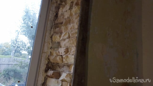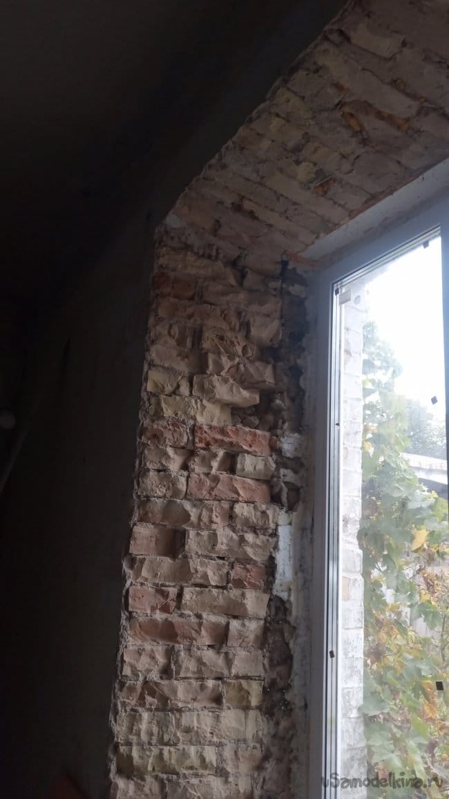 Заменив в старом доме окна, я столкнулся с тем, что необходимо восстанавливать откосы. Как правило, это требуется всегда при замене окон, но, в моём случае, случай получился более тяжёлым!))) Стены, как я уже неоднократно упоминал, в этом доме очень неровные. Откосы были тоже сделаны на злазок.))) При этом, даже на глаз бросалась в глаза их кривизна. Кроме этого, на штукатурке оконных откосов были видны следы плесени (что говорит о наличии конденсирующейся влаги. А это, в свою очередь, может быть по двум причинам - неправильный расчёт "точки росы" (что маловероятно при толщине стен в 90 см), или недостаточность уплотнений. (А вот это уже ближе к истине. Монтажной пены в 19-м веке не было))). Отбив старую штукатурку, я обнаружил под ней очень не ровную кирпичную кладку. При помощи перфоратора, я сбил особо выпирающие неровности. Получилось примерно как-то вот так: